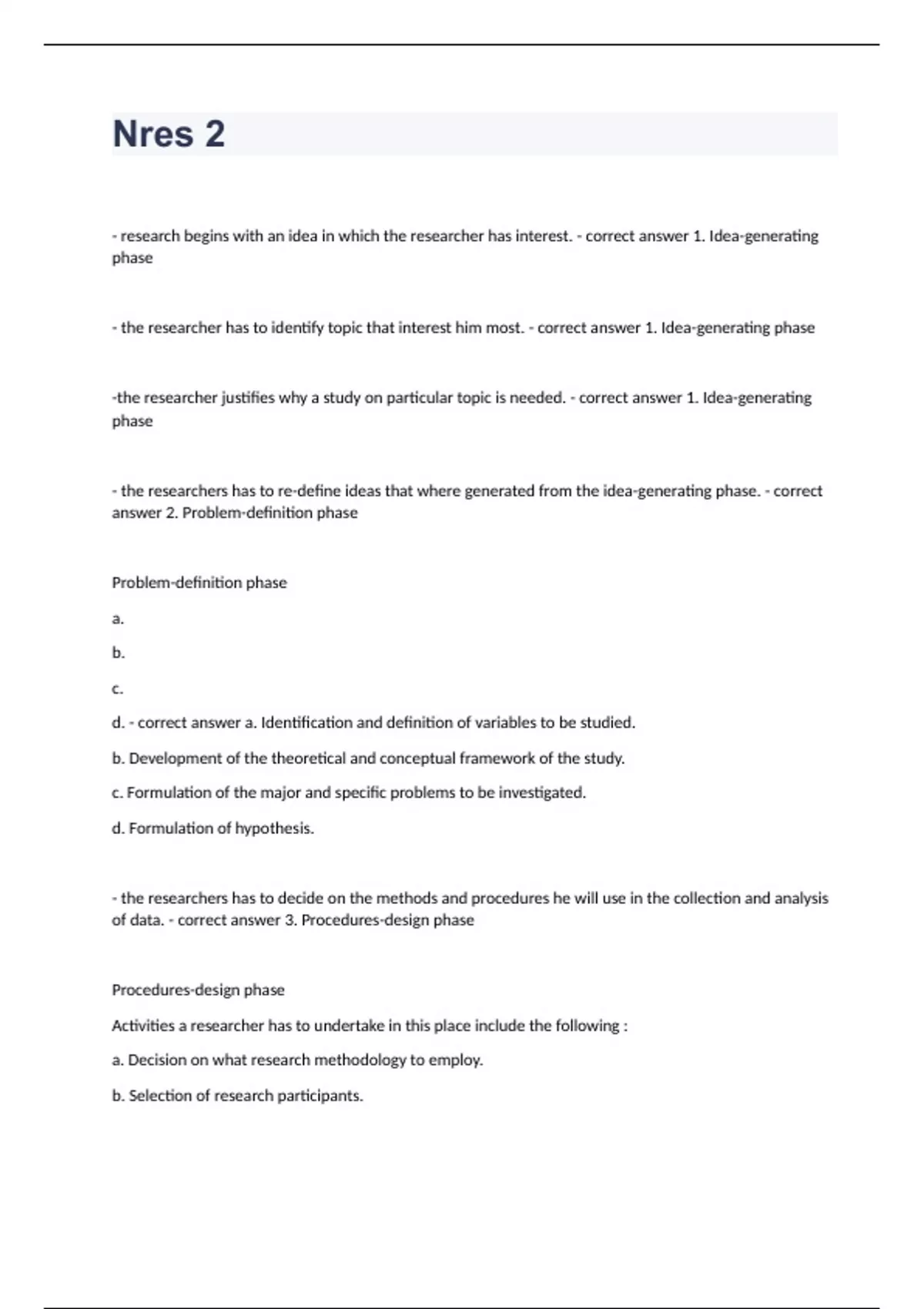 Nres 2 Question and answers 100% correct 2023/2024- research begins with an idea in which the researcher has interest. - correct answer 1. Idea-generating phase - the researcher has to identify topic that interest him most. - correct answer 1. Idea-generating phase -the researcher justifies why a study on particular topic is needed. - correct answer 1. Idea-generating phase - the researchers has to re-define ideas that where generated from the idea-generating phase. - correct answer 2. Problem-definition phase Problem-definition phase a. b. c.