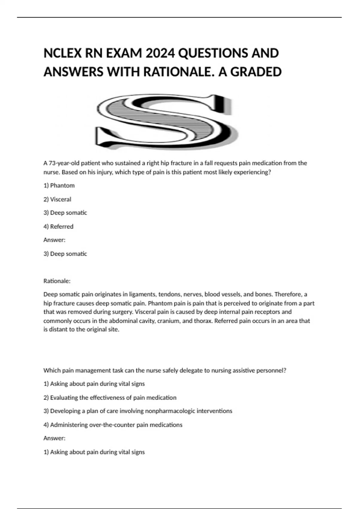 NCLEX RN EXAM 2024 QUESTIONS AND ANSWERS WITH RATIONALE. A GRADED A 73-year-old patient who sustained a right hip fracture in a fall requests pain medication from the nurse. Based on his injury, which type of pain is this patient most likely experiencing? 1) Phantom 2) Visceral 3) Deep somatic 4) Referred Answer: 3) Deep somatic Rationale: Deep somatic pain originates in ligaments, tendons, nerves, blood vessels, and bones. Therefore, a hip fracture causes deep somatic pain. Phantom pain is pain that is perceived to originate from a part that was removed during surgery. Visceral pain is caused by deep internal pain receptors and commonly occurs in the abdominal cavity, cranium, and thorax. Referred pain occurs in an area that is distant to the original site. Which pain management task can the nurse safely delegate to nursing assistive personnel? 1) Asking about pain during vital signs 2) Evaluating the effectiveness of pain medication 3) Developing a plan of care involving nonpharmacologic interventions 4) Administering over-the-counter pain medications Answer: 1) Asking about pain during vital signs Rationale: The nurse can delegate the task of asking about pain when nursing assistive personnel (NAP) obtain vital signs. The NAP must be instructed to report findings to the nurse without delay. The nurse should evaluate the effectiveness of pain medications and develop the plan of care. Administering over-the-counter and prescription medications is the responsibility of the registered nurse or licensed practical nurse. We have an expert-written solution to this problem! Brainpower Read More Which factor in the patient's past medical history dictates that the nurse exercise caution when administering acetaminophen (Tylenol)? 1) Hepatitis B 2) Occasional alcohol use 3) Allergy to aspirin 4) Gastric irritation with bleeding Answer: 1) Hepatitis B Rationale: Even in recommended doses, acetaminophen can cause severe hepatotoxicity in patients with liver disease, such as hepatitis B. Patients who consume alcohol regularly should also use acetaminophen cautiously. Those allergic to aspirin or other nonsteroidal anti-inflammatory drugs (NSAIDs) can use acetaminophen safely. Acetaminophen rarely causes gastrointestinal (GI) problems; therefore, it can be used for those with a history of gastric irritation and bleeding