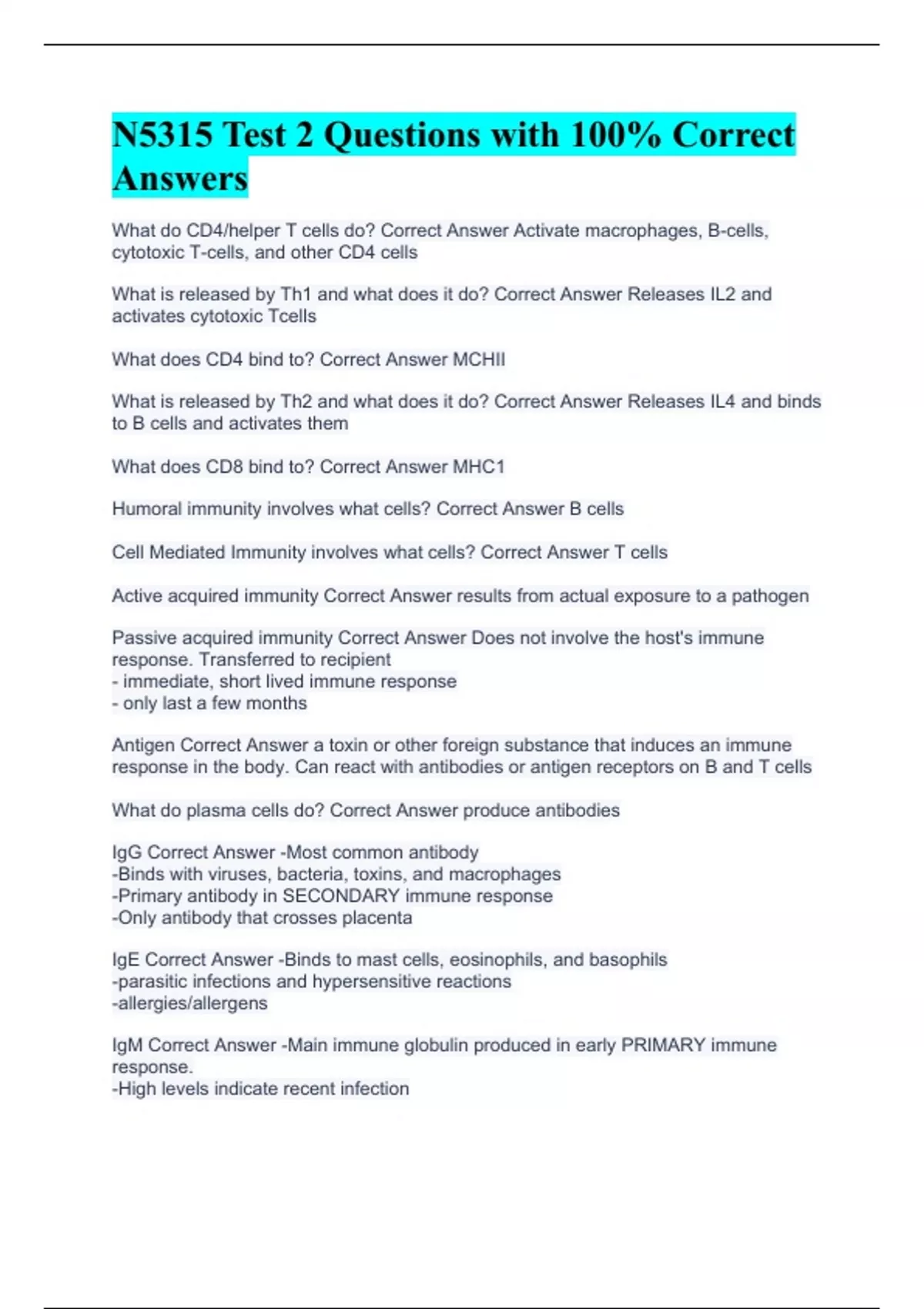 What do CD4/helper T cells do? Correct Answer Activate macrophages, B-cells, cytotoxic T-cells, and other CD4 cells What is released by Th1 and what does it do? Correct Answer Releases IL2 and activates cytotoxic Tcells What does CD4 bind to? Correct Answer MCHII What is released by Th2 and what does it do? Correct Answer Releases IL4 and binds to B cells and activates them What does CD8 bind to? Correct Answer MHC1 Humoral immunity involves what cells? Correct Answer B cells Cell Mediated Immunity involves what cells? Correct Answer T cells Active acquired immunity Correct Answer results from actual exposure to a pathogen Passive acquired immunity Correct Answer Does not involve the host's immune response. Transferred to recipient - immediate, short lived immune response - only last a few months Antigen Correct Answer a toxin or other foreign substance that induces an immune response in the body. Can react with antibodies or antigen receptors on B and T cells What do plasma cells do? Correct Answer produce antibodies IgG Correct Answer -Most common antibody -Binds with viruses, bacteria, toxins, and macrophages -Primary antibody in SECONDARY immune response -Only antibody that crosses placenta IgE Correct Answer -Binds to mast cells, eosinophils, and basophils -parasitic infections and hypersensitive reactions -allergies/allergens IgM Correct Answer -Main immune globulin produced in early PRIMARY immune response. -High levels indicate recent infection