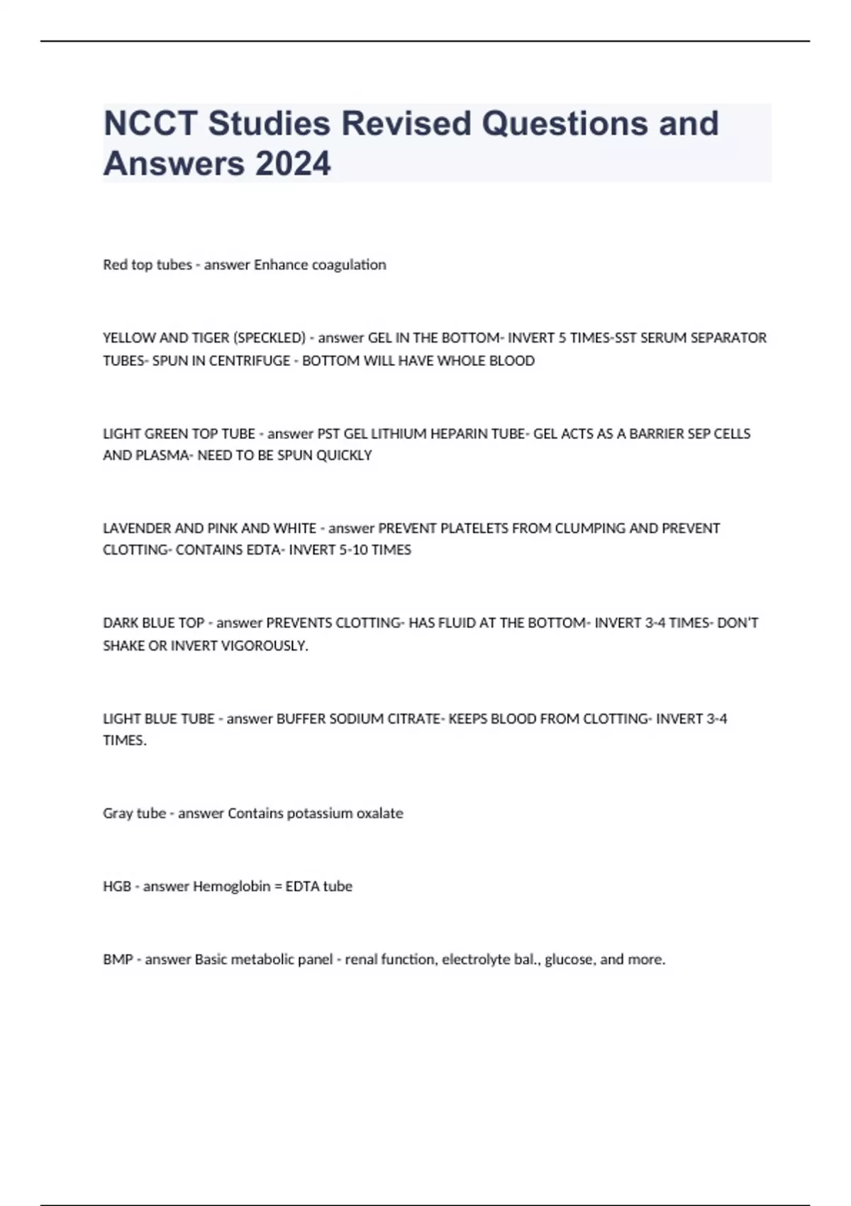 NCCT Studies Revised Questions and Answers 2024 LIGHT GREEN TOP TUBE PST GEL LITHIUM HEPARIN TUBE- GEL ACTS AS A BARRIER SEP CELLS AND PLASMA- NEED TO BE SPUN QUICKLY LAVENDER AND PINK AND WHITE PREVENT PLATELETS FROM CLUMPING AND PREVENT CLOTTING- CONTAINS EDTA- INVERT 5-10 TIMES DARK BLUE TOP PREVENTS CLOTTING- HAS FLUID AT THE BOTTOM- INVERT 3-4 TIMES- DON'T SHAKE OR INVERT VIGOROUSLY. LIGHT BLUE TUBE BUFFER SODIUM CITRATE- KEEPS BLOOD FROM CLOTTING- INVERT 3-4 TIMES.