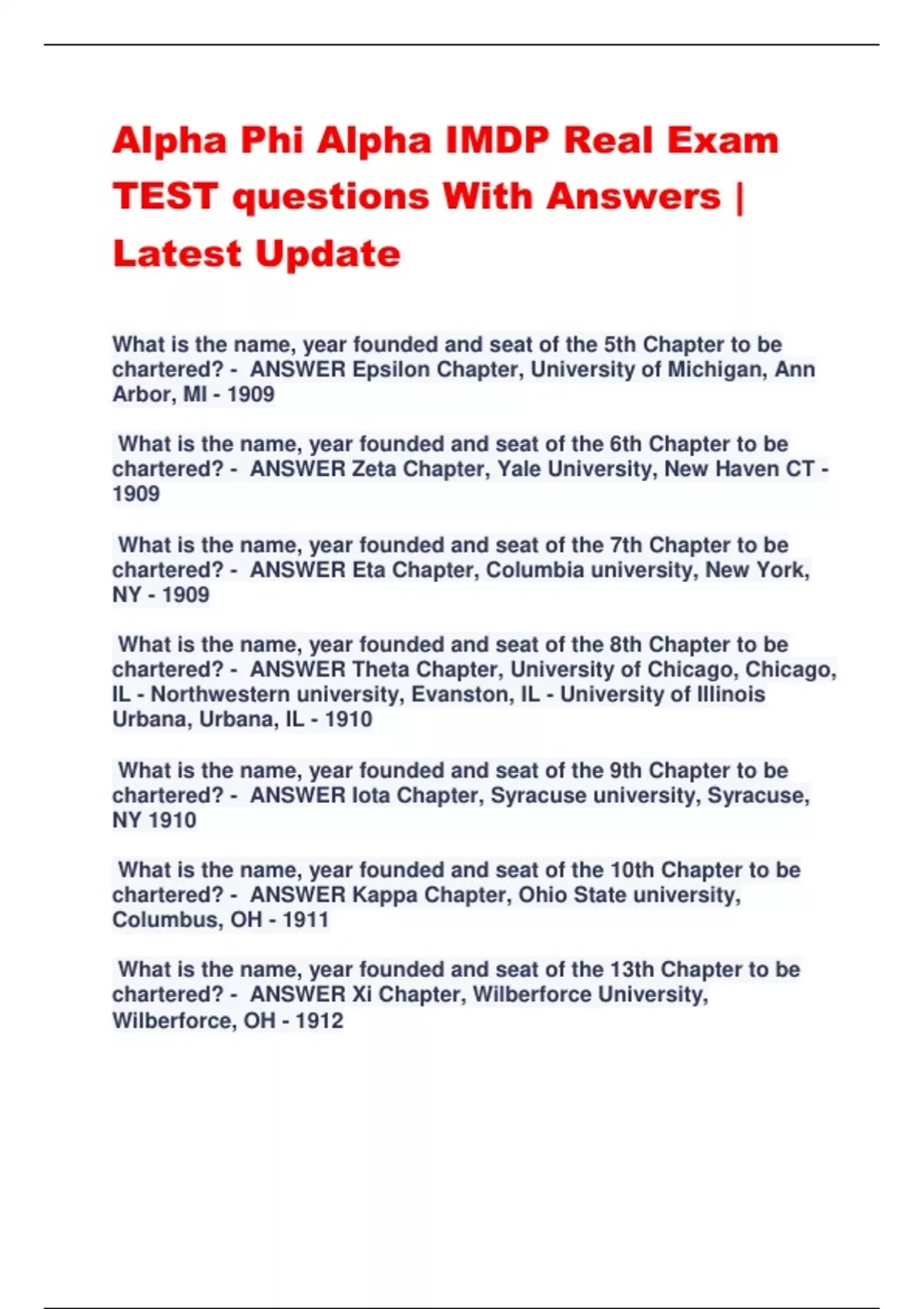Alpha Phi Alpha IMDP Real Exam TEST questions With Answers | Latest Update What is the name, year founded and seat of the 5th Chapter to be chartered? - ANSWER Epsilon Chapter, University of Michigan, Ann Arbor, MI - 1909 What is the name, year founded and seat of the 6th Chapter to be chartered? - ANSWER Zeta Chapter, Yale University, New Haven CT - 1909 What is the name, year founded and seat of the 7th Chapter to be chartered? - ANSWER Eta Chapter, Columbia university, New York, NY - 1909 What is the name, year founded and seat of the 8th Chapter to be chartered? - ANSWER Theta Chapter, University of Chicago, Chicago, IL - Northwestern university, Evanston, IL - University of Illinois Urbana, Urbana, IL - 1910 What is the name, year founded and seat of the 9th Chapter to be chartered? - ANSWER Iota Chapter, Syracuse university, Syracuse, NY 1910 What is the name, year founded and seat of the 10th Chapter to be chartered? - ANSWER Kappa Chapter, Ohio State university, Columbus, OH - 1911 What is the name, year founded and seat of the 13th Chapter to be chartered? - ANSWER Xi Chapter, Wilberforce University, Wilberforce, OH - 1912 What is the name, year founded and seat of the 14th Chapter to be chartered? - ANSWER Omicron Chapter, University of Pittsburgh, Pittsburgh, PA - 1913 What is the name of the college Chapter Chartered on the campus of the University of Minnesota? - ANSWER Mu Chapter What is the year founded and seat of (Campus and City) of Nu Chapter? - ANSWER Lincoln university, Lincoln, PA 1912 What is the name, year founded and seat of the 15th Chapter to be chartered? - ANSWER Pi Chapter, Case Western Reserve University, Cleveland, OH - 1914 The fraternity's 16th Chapter to be chartered later became an alumni chapter. What is the name and year founded of this Philadelphia chapter? - ANSWER Rho Chapter - 1914 At the 8th Annual Convention a request was approved to establish this chapter in the Northeast which would pull from Boston University, Tufts College, MIT, Suffolk Law School, Northwestern University and Harvard University for its membership. - ANSWER Sigma Chapter Who is the Author of "Test of a Man"? - ANSWER Author Unknown What is the first stanza of the poem "Test of a Man"? - ANSWER The test of a man is the fight that he makes The grit that he daily shows The way he stands upon his feet, and takes life's numerous bumps and blows What is the 2nd stanza of the poem "Test of a Man"? - ANSWER A coward can smile when there's naught to fear, and nothing his progress bars, But it takes a man to stand and cheer, while the other fellow stars. What is the 3rd stanza of the poem "Test of a Man"? - ANSWER It isn't the victory after all but the fight that a brother makes. A man when driven against the wall, Still stands erect and takes the blows of fate. What is the 4th stanza of the poem "Test of a Man"? - ANSWER With his head held high, bleeding, bruised and pale, Is the man who will win and fate defied, For he isn't afraid to fail. Who is the author of "Invictus"? - ANSWER William Earnest Henley What is the first stanza of the poem "Invictus"? - ANSWER Out of the night that covers me, Black as the pit from pole to pole, I thank whatever Gods may be, For my unconquerable soul What is the 2nd stanza of the poem "Invictus"? - ANSWER In the fell clutch of circumstanc