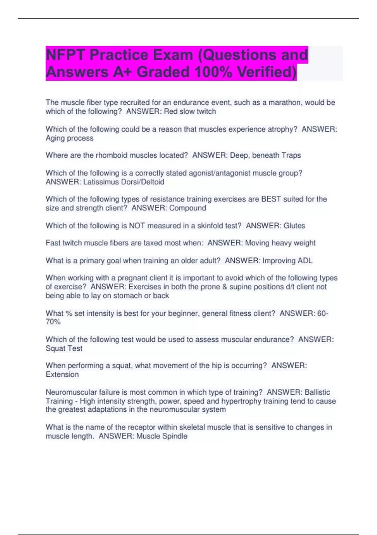 NFPT Practice Exam (Questions and Answers A+ Graded 100% Verified) The muscle fiber type recruited for an endurance event, such as a marathon, would be which of the following? ANSWER: Red slow twitch Which of the following could be a reason that muscles experience atrophy? ANSWER: Aging process Where are the rhomboid muscles located? ANSWER: Deep, beneath Traps Which of the following is a correctly stated agonist/antagonist muscle group? ANSWER: Latissimus Dorsi/Deltoid Which of the following types of resistance training exercises are BEST suited for the size and strength client? ANSWER: Compound Which of the following is NOT measured in a skinfold test? ANSWER: Glutes Fast twitch muscle fibers are taxed most when: ANSWER: Moving heavy weight What is a primary goal when training an older adult? ANSWER: Improving ADL When working with a pregnant client it is important to avoid which of the following types of exercise? ANSWER: Exercises in both the prone & supine positions d/t client not being able to lay on stomach or back What % set intensity is best for your beginner, general fitness client? ANSWER: 60-70% Which of the following test would be used to assess muscular endurance? ANSWER: Squat Test When performing a squat, what movement of the hip is occurring? ANSWER: Extension Neuromuscular failure is most common in which type of training? ANSWER: Ballistic Training - High intensity strength, power, speed and hypertrophy training tend to cause the greatest adaptations in the neuromuscular system What is the name of the receptor within skeletal muscle that is sensitive to changes in muscle length. ANSWER: Muscle Spindle Which of the following is NOT a diagnostic fitness assessment test for new clients? ANSWER: Stiff Leg Deadlift Test The muscular endurance component of a general exercise program should affect as much total muscle tissue as possible. To achieve this, perform 3 to 4 continuous circuits of these 3 suggested movements: ANSWER: Pushing Pulling Squatting A trainer notices that their beginning client has performed poorly on various diagnostic tests relating to balance and coordination. Which of the following is the BEST choice for the trainer to implement based solely on this information? ANSWER: Core Conditioning - Core strength helps with balance A trainer decides to implement mostly compound movements into a client's program. Which of the following exercises is NOT a compound movement? ANSWER: Seated dumbbell curls A weight-loss client expresses to her trainer that she would rather not perform resistance training exercises, in order to prevent herself from "bulking up". Which if the following is the BEST way for the trainer to address this situation? ANSWER: Express the importance of resistance training as it pertains to individuals wishing to lose weight A trainer begins working with a slender 18 year old male client seeking to gain muscle mass. The client informs the trainer that he would like to gain 30 pounds of muscle in the first five weeks of training. Which of the following is the MOST proper response from the trainer in this situation? ANSWER: Inform the client that it will likely take four to six months of training to reach this kind of goal Which of the following is a contraindication of exercise? ANSWER: Rapid pulse For the beginner client, whose primary goal is fat loss, the trainer should design an exercise program that includes which of the following: ANSWER: High Rep Range Low Intensity Aerobic Training Static stretching should be performed: ANSWER: At the end of the workout When thinking through a training program for a new client, the trainer should first consider which of the following: ANSWER: How often they can commit to training Which of the following is the BEST reason for a trainer to re-evaluate a client's program? ANSWER: Client is NOT progressing with the exercise program A healthy diet should consist of no more than: ANSWER: 20-25% Which of the following is a contraindication to exercise? ANSWER: Constant light headedness Which of the following is initially utilized when beginning a session with aerobic activity? ANSWER: Glucose Which of the following is the only usable fuel source for the brain? ANSWER: Glucose Ingested protein moves to the stomach where it is acted on by which enzyme? ANSWER: Pepsin Total Caloric Expenditure is: ANSWER: The estimate of calories needed to sustain daily activity Prior to creating and implementing a fitness program, a trainer should: ANSWER: Perform a complete health screening A new, apparently healthy client wishing to improve their cardiorespiratory endurance admits that they smoke a half pack of cigarettes' every day. Which of the following is the BEST way for the trainer to initially address this situation? ANSWER: Casually explain the contraindications of smoking as it relates to performing exercise and how it could impede their results, ask if you can be of any help finding resources that could support them in quitting A client, who has purchased multiple training sessions in advance, continually arrives at the gym more interested in chatting about personal matters than actually working out. A results-oriented trainer should proceed by: ANSWER: Reminding the client of the dedication required to improve their health and well-being and that their time with you is valuable. Explain to them that you want to help them to get the most out of the time you have together In addition to medical history, what is the MOST important thing you should talk to a client about? ANSWER: Their personal fitness goals A client says they want to do an exercise they saw on YouTube that you know is wrong for them, how do you respond? ANSWER: Educate the client on why it's not best for them and then demonstrate an alternative exercise The Karvonen Formula is used to find which of the following: ANSWER: Exercise heart rate To remember the measurable components of an exercise training program, use the F.I.T.T. principle, which stands for