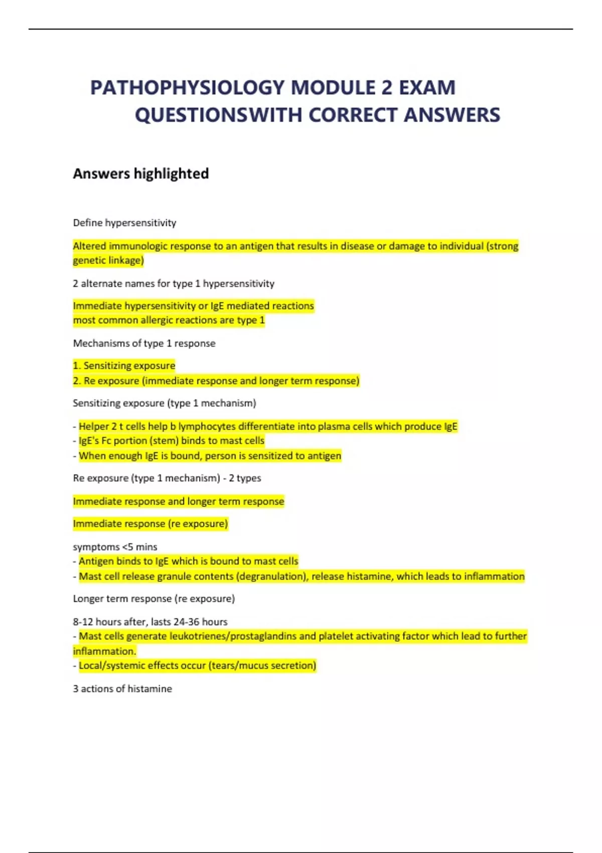 PATHOPHYSIOLOGY MODULE 2 EXAM QUESTIONS WITH CORRECT ANSWERS Answers highlighted Define hypersensitivity Altered immunologic response to an antigen that results in disease or damage to individual (strong genetic linkage) 2 alternate names for type 1 hypersensitivity Immediate hypersensitivity or IgE mediated reactions most common allergic reactions are type 1 Mechanisms of type 1 response 1. Sensitizing exposure 2. Re exposure (immediate response and longer term response) Sensitizing exposure (type 1 mechanism) - Helper 2 t cells help b lymphocytes differentiate into plasma cells which produce IgE - IgE's Fc portion (stem) binds to mast cells - When enough IgE is bound, person is sensitized to antigen Re exposure (type 1 mechanism) - 2 types Immediate response and longer term response Immediate response (re exposure) symptoms <5 mins - Antigen binds to IgE which is bound to mast cells - Mast cell release granule contents (degranulation), release histamine, which leads to inflammation Longer term response (re exposure) 8-12 hours after, lasts 24-36 hours - Mast cells generate leukotrienes/prostaglandins and platelet activating factor which lead to further inflammation. - Local/systemic effects occur (tears/mucus secretion) 3 actions of histamine 1. increases vascular permeability 2. causes vasodilation 3. contracts bronchial smooth muscle tissue What is type 2 hypersensitivity (name) Antibody dependent cytotoxic hypersensitivity Where are antigens located that react with antibodies in type 2 response Ab react to Ag fixed to surface of various body cells/specific tissues Mechanisms of type 2 response (3) 1. cell destruction 2. inflammation 3. altered cell metabolism Cell destruction (type 2 mechanism) Ab (IgG/IgM) bind to Ag on tissue cell surface and: - Cause phagocytosis (opsonization) - Activate complement (result: phagocytosis/cell lysis) - E.g., blood transfusion reaction Inflammation (type 2 mechanism) - When Ab are bound to extracellular connective tissue - Ab activate complement which cause inflammatory response (activating mast cells - releasing histamine and acting as chemokines to attract monocytes/neutrophils) - Cell injury results from release of proteases - E.g., Goodpasture syndrome Altered cell metabolism (type 2 mechanism) - Ab attach to receptors on cell surface which change cell function (2 ways) - 1. Replacing chemical that normally fits in receptor (ligand), which inappropriately stimulates cell (e.g., graves disease - thyroid gland is stimulated inappropriately to produce thyroid hormone) - 2. Blocking/destroying receptor (e.g., myasthenia gravis - acetylcholine receptors on muscle cells are blocked) Where are Ag located that react with Ab in type 3 response Ab-ag complexes formed in circulation then deposited on cell surface Type 3 hypersensitivity (name) Immune complex mediated hypersensitivity General mechanism of type 3 response with example - Antibodies activate complement which: - Attract neutrophils/opsonize tissue - Lysosomal enzymes/inflammatory mediators released by neutrophils to produce inflammation/damage to underlying tissues - Not tissue specific - E.g., Systematic lupus erythematosus (SLE) Ab-Ag in systematic immune complex disorder vs ... Ab-ag complex deposited in wide range of body tissues (e.g., serum sickness) Ab-Ag in localized immune complex disorder Due to injected drug/vaccine/insect bite. Severe in some cases (e.g., Arthus Reaction) Which mechanism causes serum sickness and how is it caused Systematic immune complex disorder. Caused by antibiotics (penicillin), foods, drugs, venom Which mechanism causes Arthus reaction and how is it caused Localized immune complex disorder Caused by injected drug, insect sting, vaccine Type 4 hypersensitivity (name) Cell mediated hypersensitivity