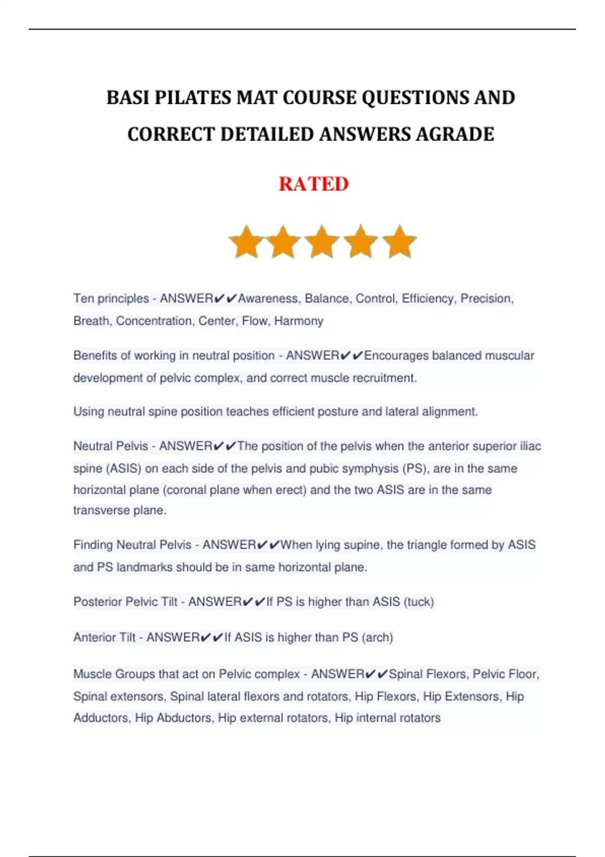 BASI PILATES MAT COURSE QUESTIONS AND CORRECT DETAILED ANSWERS AGRADE