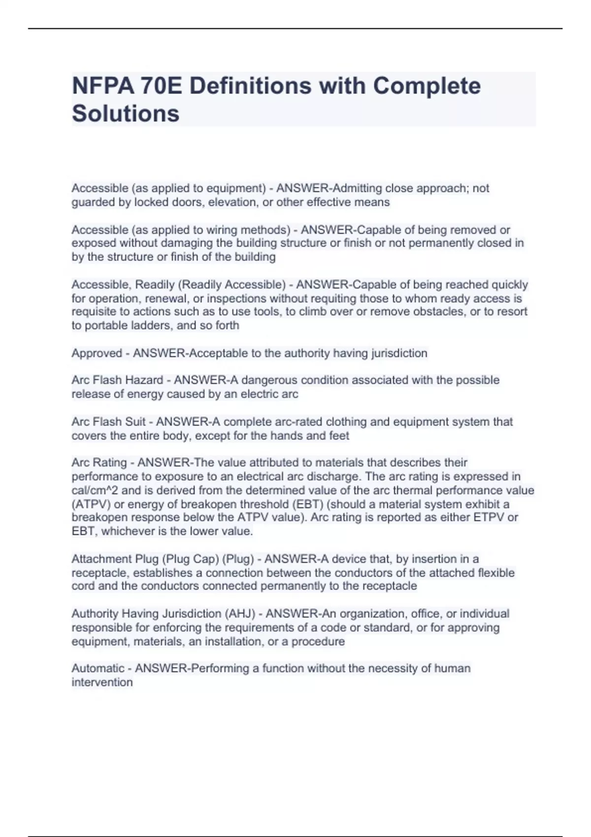 NFPA 70E Definitions with Complete Solutions NFPA 70E Definitions with Complete Solutions NFPA 70E Definitions with Complete Solutions Accessible (as applied to equipment) - ANSWER-Admitting close approach; not guarded by locked doors, elevation, or other effective means Accessible (as applied to wiring methods) - ANSWER-Capable of being removed or exposed without damaging the building structure or finish or not permanently closed in by the structure or finish of the building Accessible, Readily (Readily Accessible) - ANSWER-Capable of being reached quickly for operation, renewal, or inspections without requiting those to whom ready access is