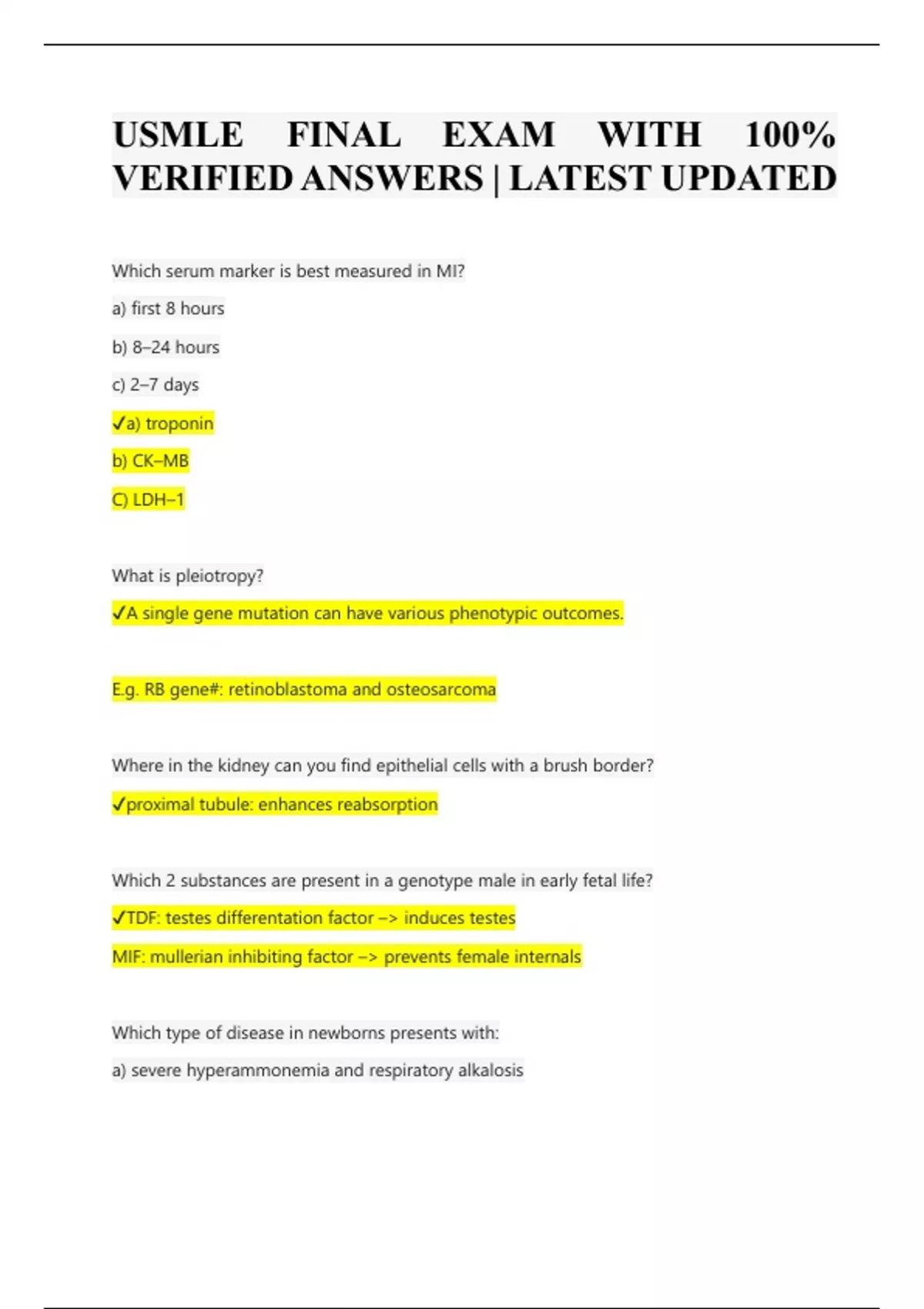 Which serum marker is best measured in MI? a) first 8 hours b) 8–24 hours c) 2–7 days a) troponin b) CK–MB C) LDH–1 What is pleiotropy? A single gene mutation can have various phenotypic outcomes. E.g. RB gene#: retinoblastoma and osteosarcoma Where in the kidney can you find epithelial cells with a brush border? proximal tubule: enhances reabsorption Which 2 substances are present in a genotype male in early fetal life? TDF: testes differentation factor –> induces testes MIF: mullerian inhibiting factor –> prevents female internals
