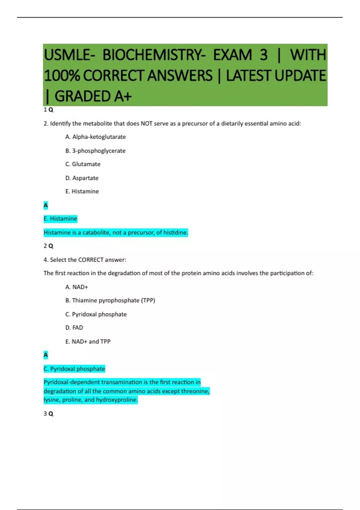 USMLE- BIOCHEMISTRY- EXAM 3 | WITH 100% CORRECT ANSWERS | LATEST UPDATE | GRADED A+