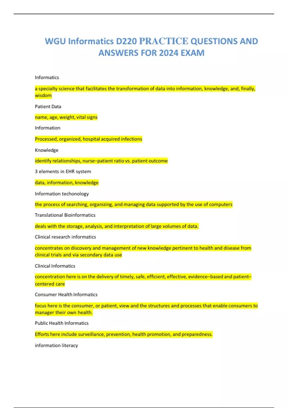 WGU Informatics D220 PRACTICE QUESTIONS AND ANSWERS FOR 2024 EXAM