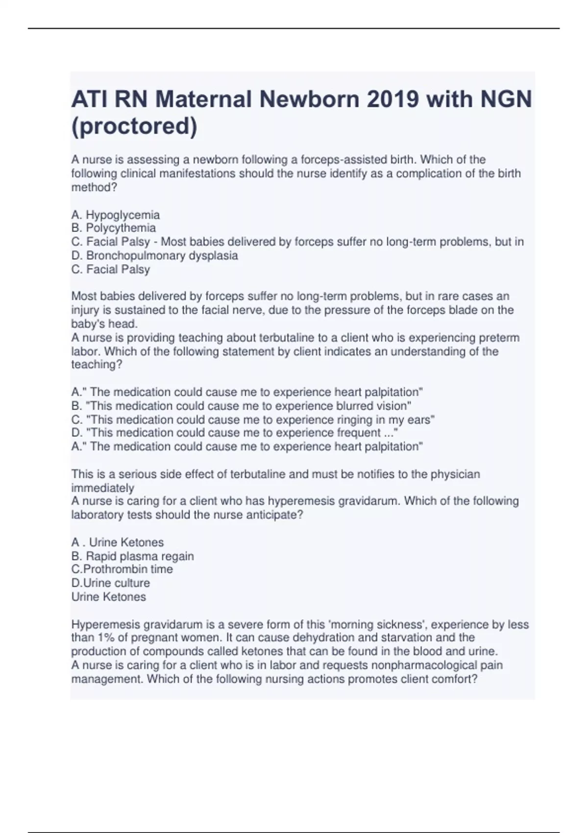ATI RN Maternal Newborn 2019 with NGN (proctored) A nurse is assessing a newborn following a forceps-assisted birth. Which of the following clinical manifestations should the nurse identify as a complication of the birth method? A. Hypoglycemia B. Polycythemia C. Facial Palsy - Most babies delivered by forceps suffer no long-term problems, but in D. Bronchopulmonary dysplasia C. Facial Palsy Most babies delivered by forceps suffer no long-term problems, but in rare cases an injury is sustained to the facial nerve, due to the pressure of the forceps blade on the baby's head. A nurse is providing teaching about terbutaline to a client who is experiencing preterm labor. Which of the following statement by client indicates an understanding of the teaching? A." The medication could cause me to experience heart palpitation" B. "This medication could cause me to experience blurred vision" C. "This medication could cause me to experience ringing in my ears" D. "This medication could cause me to experience frequent ..." A." The medication could cause me to experience heart palpitation" This is a serious side effect of terbutaline and must be notifies to the physician immediately A nurse is caring for a client who has hyperemesis gravidarum. Which of the following laboratory tests should the nurse anticipate? A . Urine Ketones B. Rapid plasma regain C.Prothrombin time D.Urine culture Urine Ketones Hyperemesis gravidarum is a severe form of this 'morning sickness', experience by less than 1% of pregnant women. It can cause dehydration and starvation and the production of compounds called ketones that can be found in the blood and urine. A nurse is caring for a client who is in labor and requests nonpharmacological pain management. Which of the following nursing actions promotes client comfort? A. Assisting the client into squatting position B. Having the client lie in a supine position C. Applying fundal pressure during contractions D. Encouraging the client to void every 6 hr Having the client lie in a supine position Having the patient lie in a comfortable position may help reduce sensation of pain due to labor A nurse caring for a client who is at 20 weeks of gestation and has trichomoniasis. Which of the following findings should the nurse expect? A. Thick, White Vaginal Discharge B. Urinary Frequency C. Vulva Lesions D. Malodorous Discharge Malodorous Discharge A nurse is caring for a client who is 14 weeks of gestation. At which the following locations should the nurse place the Doppler device when assessing the fetal heart rate? A . Midline 2 to 3 cm (0.8 to 1.2 in) above the symphysis pubis B. Left Upper Abdomen C. Two fingerbreadths above the umbilicus D. Lateral at the Xiphoid Process Midline 2 to 3 cm (0.8 to 1.2 in) above the symphysis pubis at 14 weeks AOG this is where to place the doppler probe to note FHT A nurse is assessing a client who is at 27 weeks of gestation and has preeclampsia. Which of the following findings should the nurse report to the provider? A. Urine protein concentration 200 mg/ 24 hr B. Creatinine 0.8 mg/ dL C. Hemoglobin 14.8 g/ dL D. Platelet Count 60.000/ mm3 Platelet Count 60.000/ mm3 platelet count of less than 100,000 correlates with how severe the condition is. A nurse is teaching about clomiphene citrate to a client who is experiencing infertility. Which of the following adverse effect should the nurse include? A. Tinnitus B. Urinary Frequency C. Breast Tenderness D. Chills Tinnitus this is a documented adverse effect of this medication A nurse is assessing a newborn upon admission to the nursery. Which of the following should the nurse expect? A. Bulging Fontanels B. Nasal Flaring C. Length from head to heel of 40 cm (15.7 in) D. Chest circumference 2 cm (0.8 in) smaller than the head circumference Chest circumference 2 cm (0.8 in) smaller than the head circumference head circumference is always 2cm more than the chest in normal term babies A nurse is planning care for a newborn who has neonatal abstinence syndrome. Which of the following interventions should the nurse include in the plan of care? A. Increase the newborn's visual sti