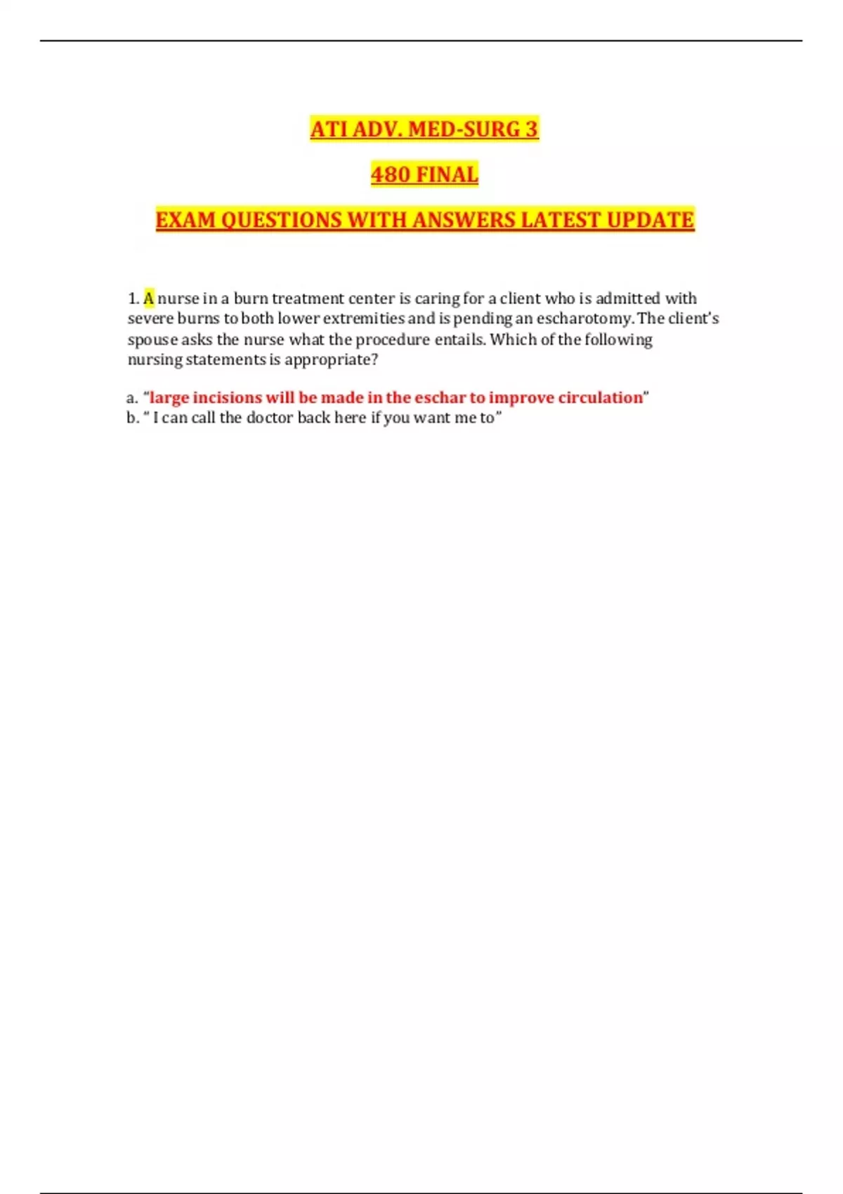 ATI ADV. MED-SURG 3 480 FINAL EXAM QUESTIONS WITH ANSWERS LATEST UPDATE 1. A nurse in a burn treatment center is caring for a client who is admitted with severe burns to both lower extremities and is pending an escharotomy. The client’s spouse asks the nurse what the procedure entails. Which of the following nursing statements is appropriate? a. “large incisions will be made in the eschar to improve circulation” b. “ I can call the doctor back here if you want me to” c. “a piece of skin will be removed and grafted over the burned area” d. “dead tissue will be surgically removed” 2. A nurse is monitoring the fluid replacement of a client who has sustained burns. Which of the following fluids is used in the first 24 hours following a burn injury? a. 5% dextrose in water b. 5% dextrose in normal saline c. normal saline d. lactated ringers 3. A nurse is caring for a client who has full-thickness burns all over 75% of his body. Which of the following methods is appropriate to accurately monitor the cardiovascular system? a. auscultate cuff blood pressure b. palpate pulse pressure c. obtain a central venous pressure d. monitor the pulmonary artery pressure 4. A nurse is assessing the depth and extent of a client who has severe burns to the face, neck, and upper extremities. Which of the following factors is the first priority when assessing the severity of the burn? a. Age of the client b. Associated medical history c. Location of the burn d. Cause of the burn 5. A client arrives at the emergency dept following an explosion at the chemical plant. He has deep partial and full-thickness chemical burns over more than 25 % of his body surface area. What is the nurse’s priority intervention? a. Initiate fluid resuscitation b. Medication for pain c. Administer antibiotics d. Maintain a patent airway 6. A nurse is caring for a client who came the emergency dept reporting chest pain. The provider suspects a myocardial infarction. While waiting for the laboratory to report the client’s troponin levels, the client asks what this blood test will show. The nurse should explain that troponin is a. An enzyme that indicates damage to brain, heart, and skeletal muscle tissues b. A protein whose levels reflect the risk for coronary artery disease c. A heart muscle protein that appears in the bloodstream when there is damage to the heart d. A protein that helps transport oxygen throughout the body 7. A nurse is assessing a client who has disseminated intravascular coagulation (DIC). Which of the following should the nurse expect in the findings? a. Excessive thrombosis and bleeding b. Progressive increase in platelet productio