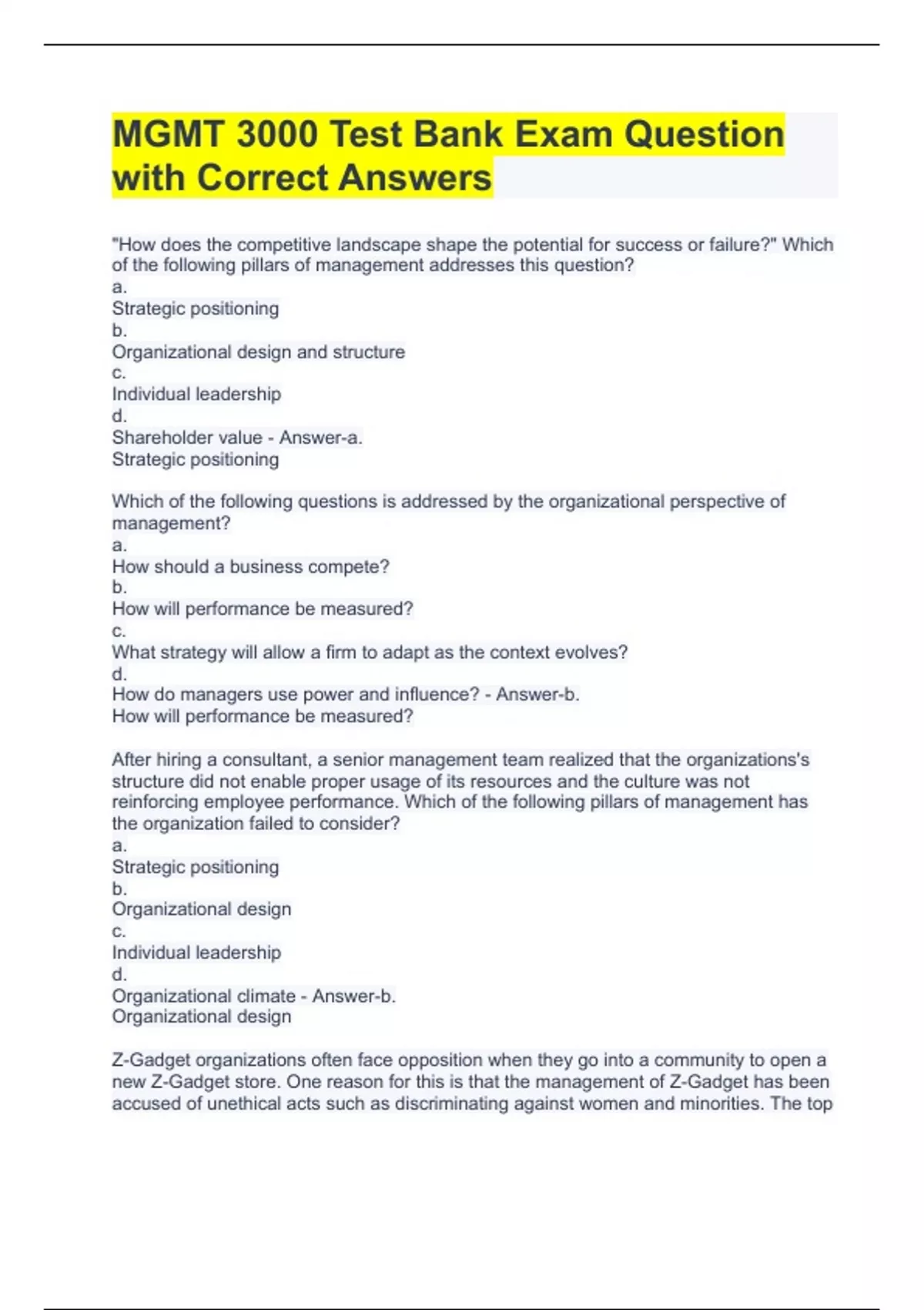 mgmt 3000 test bank exam question with correct ans