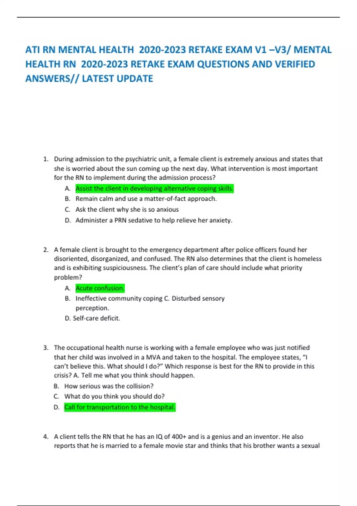 ATI RN MENTAL HEALTH RETAKE EXAM V1 –V3/ MENTAL HEALTH RN RETAKE EXAM QUESTIONS AND VERIFIED ANSWERS// LATEST UPDATE