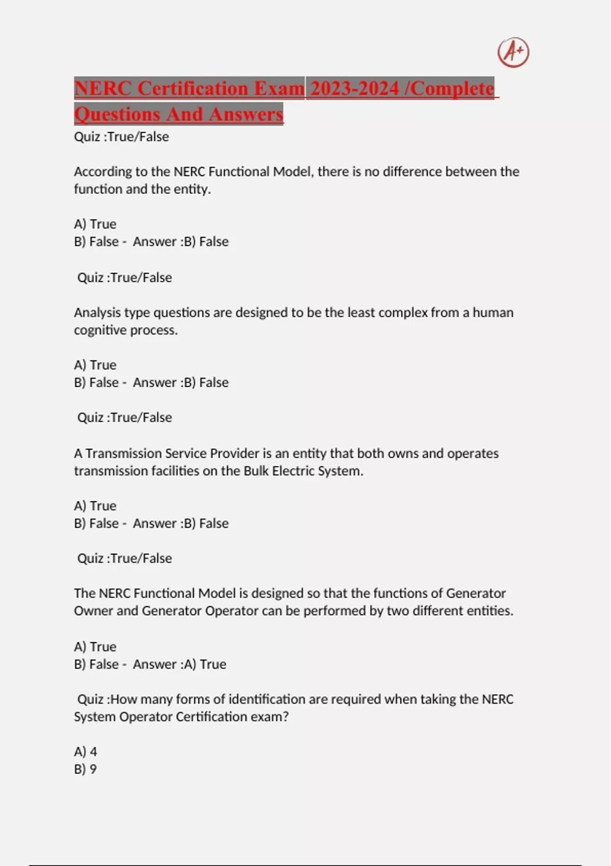 NERC Certification Exam /Complete Questions And Answers