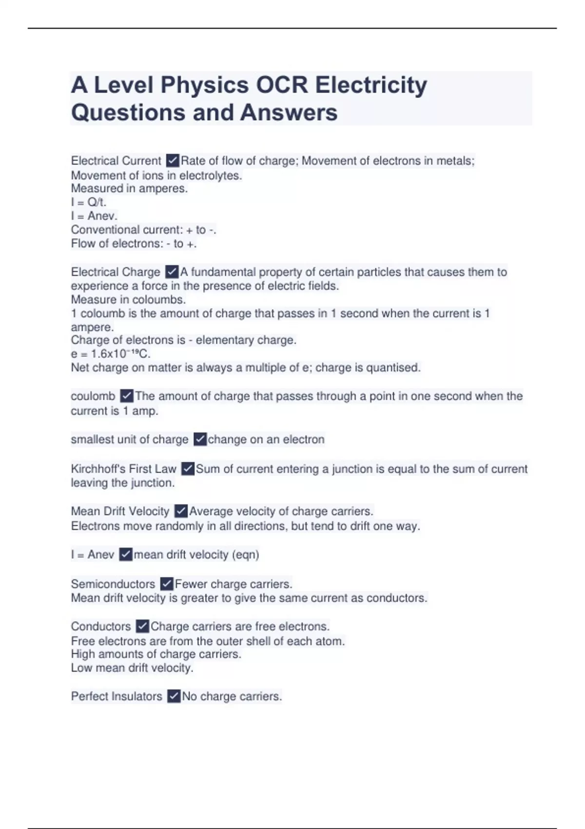 Electrical Current Rate of flow of charge; Movement of electrons in metals; Movement of ions in electrolytes. Measured in amperes. I = Q/t. I = Anev. Conventional current: + to -. Flow of electrons: - to +. Electrical Charge A fundamental property of certain particles that causes them to experience a force in the presence of electric fields. Measure in coloumbs. 1 coloumb is the amount of charge that passes in 1 second when the current is 1 ampere. Charge of electrons is - elementary charge. e = 1.6x10⁻¹⁹C. Net charge on matter is always a multiple of e; charge is quantised. coulomb The amount of charge that passes through a point in one second when the current is 1 amp. smallest unit of charge change on an electron Kirchhoff's First Law Sum of current entering a junction is equal to the sum of current leaving the junction.