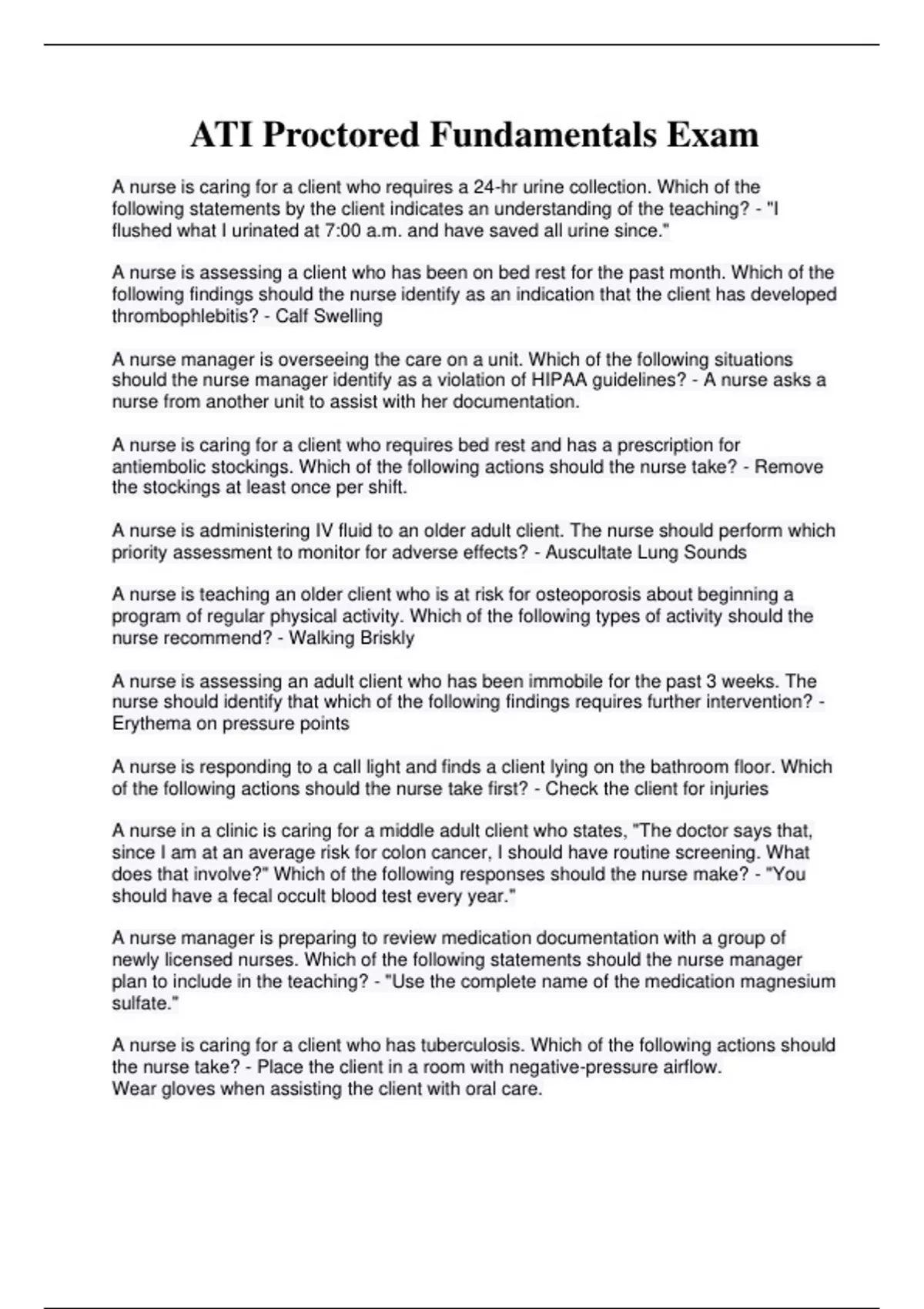 A nurse is caring for a client who requires a 24-hr urine collection. Which of the following statements by the client indicates an understanding of the teaching? - "I flushed what I urinated at 7:00 a.m. and have saved all urine since." A nurse is assessing a client who has been on bed rest for the past month. Which of the following findings should the nurse identify as an indication that the client has developed thrombophlebitis? - Calf Swelling A nurse manager is overseeing the care on a unit. Which of the following situations should the nurse manager identify as a violation of HIPAA guidelines? - A nurse asks a nurse from another unit to assist with her documentation. A nurse is caring for a client who requires bed rest and has a prescription for antiembolic stockings. Which of the following actions should the nurse take? - Remove the stockings at least once per shift. A nurse is administering IV fluid to an older adult client. The nurse should perform which priority assessment to monitor for adverse effects? - Auscultate Lung Sounds A nurse is teaching an older client who is at risk for osteoporosis about beginning a program of regular physical activity. Which of the following types of activity should the nurse recommend? - Walking Briskly A nurse is assessing an adult client who has been immobile for the past 3 weeks. The nurse should identify that which of the following findings requires further intervention? - Erythema on pressure points A nurse is responding to a call light and finds a client lying on the bathroom floor. Which of the following actions should the nurse take first? - Check the client for injuries A nurse in a clinic is caring for a middle adult client who states, "The doctor says that,