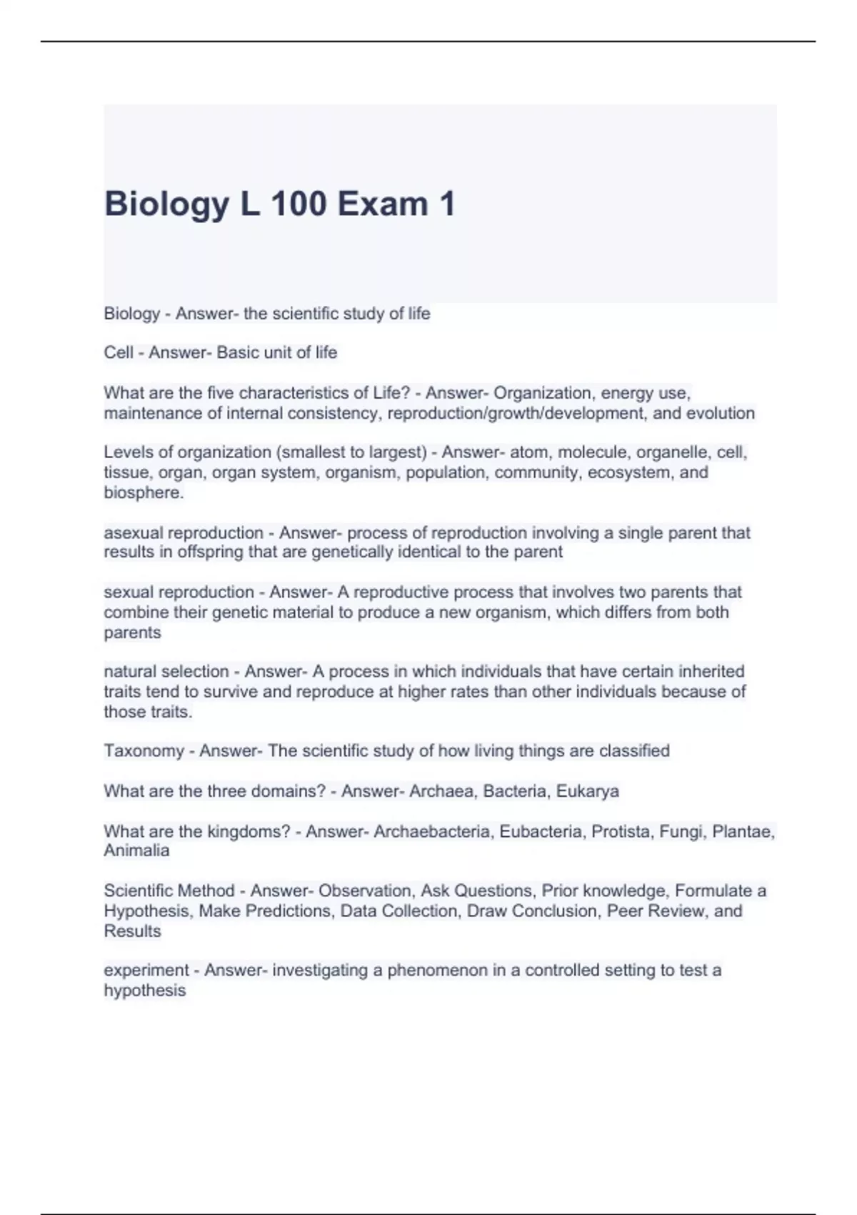 Biology L 100 Exam 1 with complete solutions