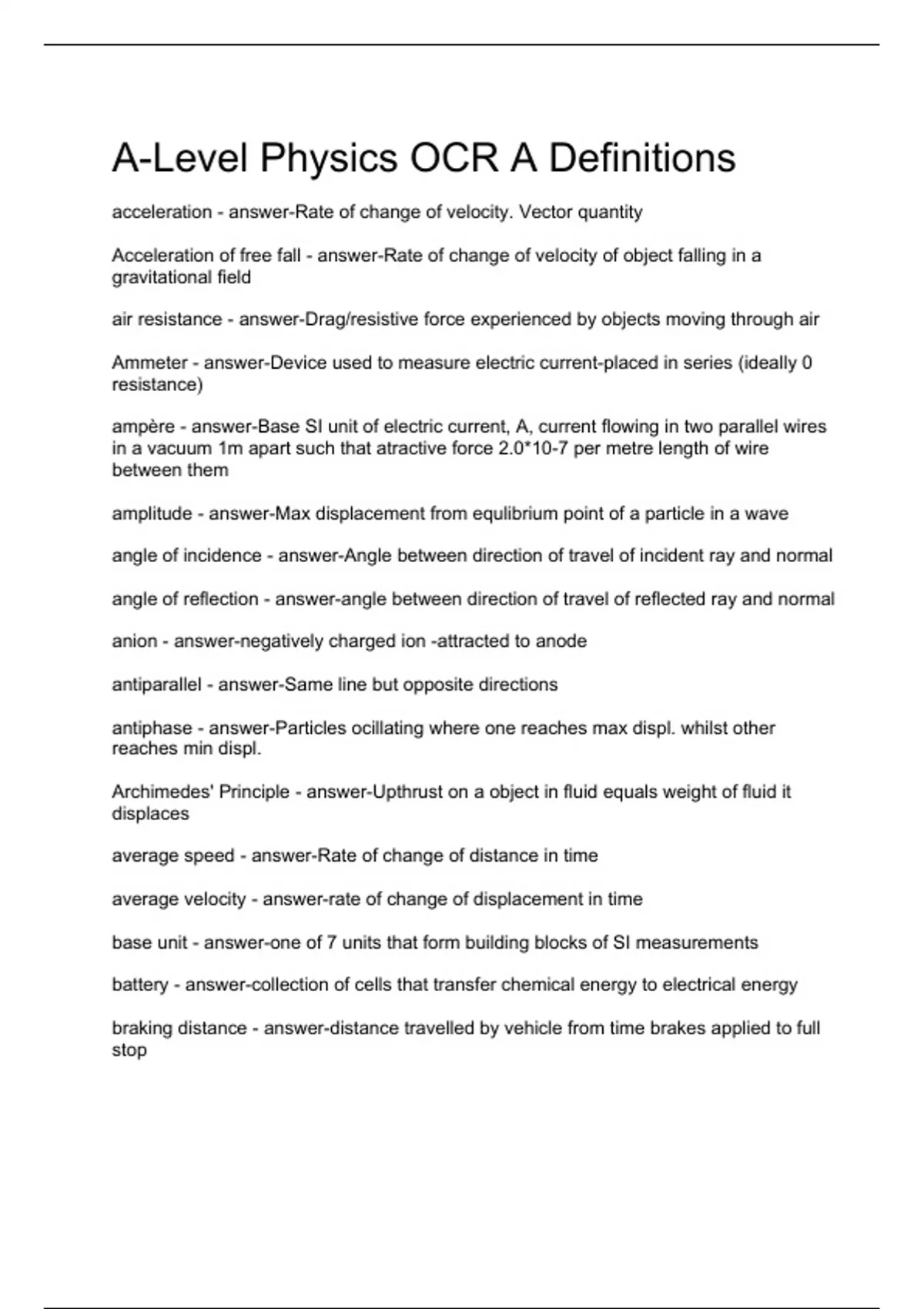 acceleration - answer-Rate of change of velocity. Vector quantity Acceleration of free fall - answer-Rate of change of velocity of object falling in a gravitational field air resistance - answer-Drag/resistive force experienced by objects moving through air Ammeter - answer-Device used to measure electric current-placed in series (ideally 0 resistance) ampère - answer-Base SI unit of electric current, A, current flowing in two parallel wires in a vacuum 1m apart such that atractive force 2.0*10-7 per metre length of wire between them amplitude - answer-Max displacement from equlibrium point of a particle in a wave angle of incidence - answer-Angle between direction of travel of incident ray and normal angle of reflection - answer-angle between direction of travel of reflected ray and normal anion - answer-negatively charged ion -attracted to anode antiparallel - answer-Same line but opposite directions antiphase - answer-Particles ocillating where one reaches max displ. whilst other reaches min displ. Archimedes' Principle - answer-Upthrust on a object in fluid equals weight of fluid it displaces average speed - answer-Rate of change of distance in time average velocity - answer-rate of change of displacement in time base unit - answer-one of 7 units that form building blocks of SI measurements battery - answer-collection of cells that transfer chemical energy to electrical energy braking distance - answer-distance travelled by vehicle from time brakes applied to full stop