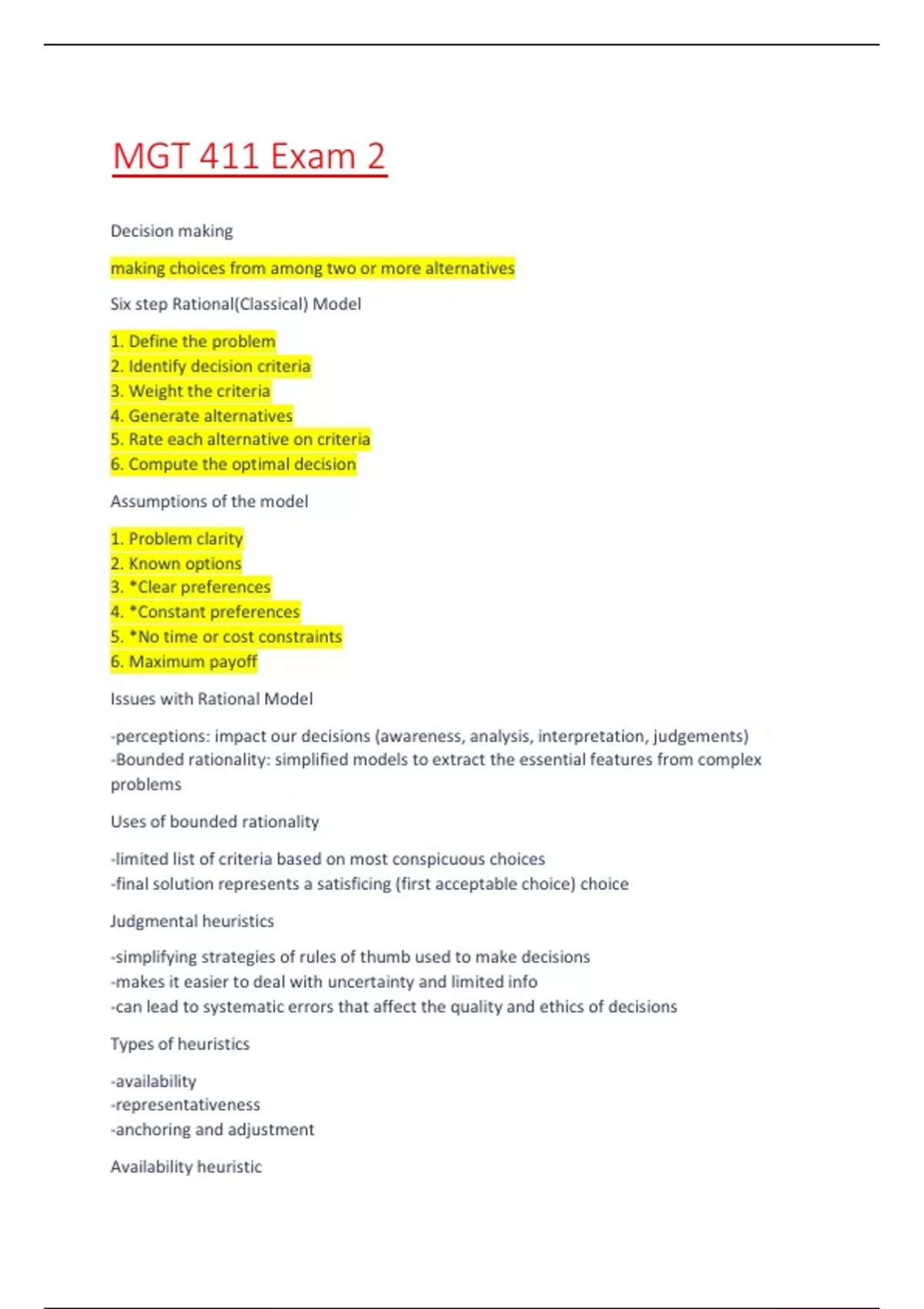 Six step Rational(Classical) Model 1. Define the problem 2. Identify decision criteria 3. Weight the criteria 4. Generate alternatives 5. Rate each alternative on criteria 6. Compute the optimal decision Assumptions of the model 1. Problem clarity 2. Known options 3. *Clear preferences 4. *Constant preferences 5. *No time or cost constraints 6. Maximum payoff Issues with Rational Model -perceptions: impact our decisions (awareness, analysis, interpretation, judgements) -Bounded rationality: simplified models to extract the essential features from complex problems Uses of bounded rationality -limited list of criteria based on most conspicuous choices -final solution represents a satisficing (first acceptable choice) choice Judgmental heuristics -simplifying strategies of rules of thumb used to make decisions -makes it easier to deal with uncertainty and limited info -can lead to systematic errors that affect the quality and ethics of decisions Types of heuristics -availability -representativeness -anchoring and adjustment Availability heuristic