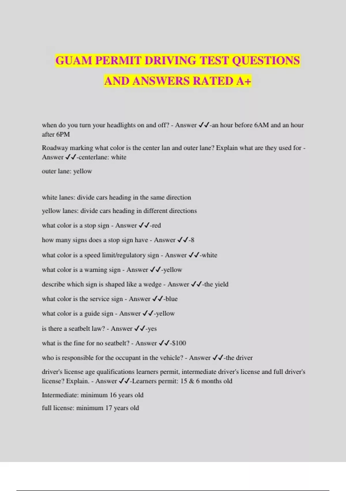 GUAM PERMIT DRIVING TEST QUESTIONS AND ANSWERS RATED A+ when do you turn your headlights on and off? - Answer ️️ -an hour before 6AM and an hour after 6PM Roadway marking what color is the center lan and outer lane? Explain what are they used for - Answer ️️ -centerlane: white outer lane: yellow white lanes: divide cars heading in the same direction yellow lanes: divide cars heading in different directions what color is a stop sign - Answer ️️ -red how many signs does a stop sign have - Answer ️️ -8 what color is a speed limit/regulatory sign - Answer ️️ -white what color is a warning sign - Answer ️️ -yellow describe which sign is shaped like a wedge - Answer ️️ -the yield what color is the service sign - Answer ️️ -blue what color is a guide sign - Answer ️️ -yellow is there a seatbelt law? - Answer ️️ -yes what is the fine for no seatbelt? - Answer ️️ -$100 who is responsible for the occupant in the vehicle? - Answer ️️ -the driver driver's license age qualifications learners permit, intermediate driver's license and full driver's license? Explain. - Answer ️️ -Learners permit: 15 & 6 months old Intermediate: minimum 16 years old full license: minimum 17 years old