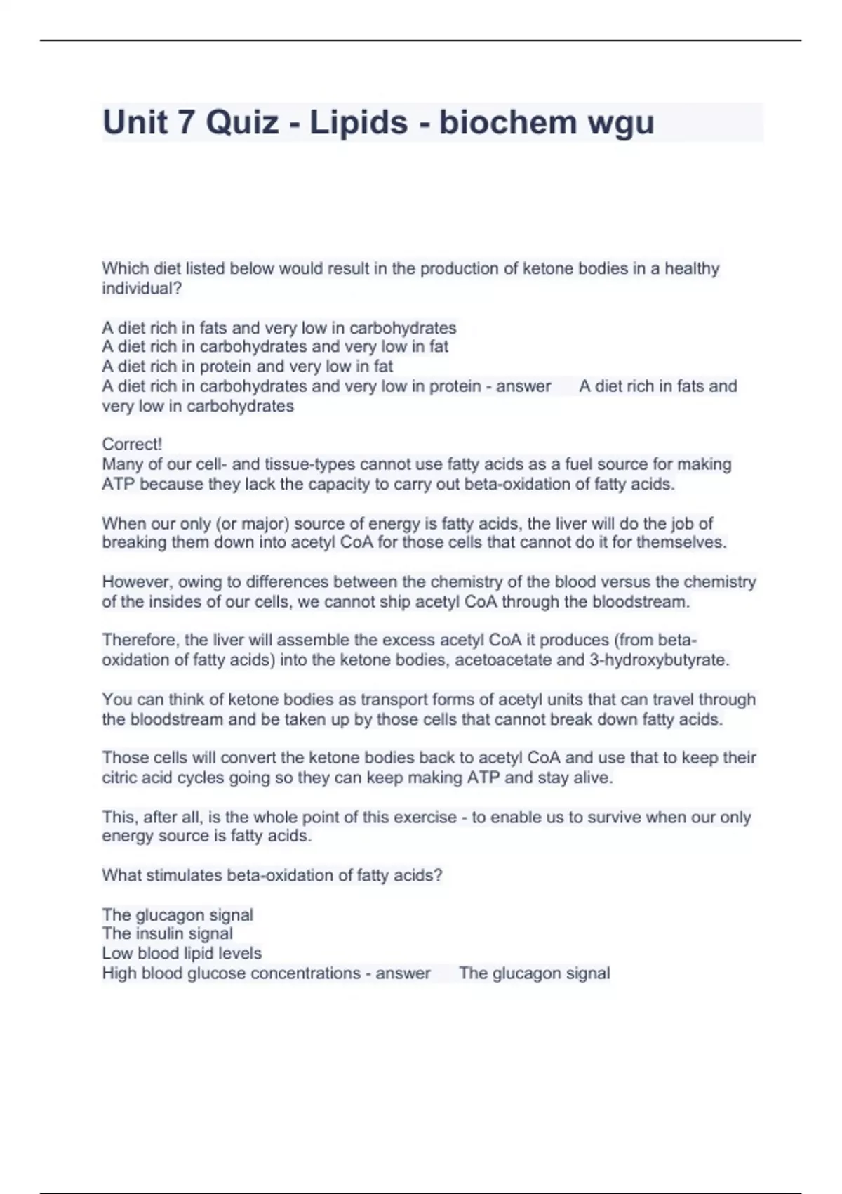Unit 7 Quiz - Lipids - biochem wgu Questions with correct Answers 2024