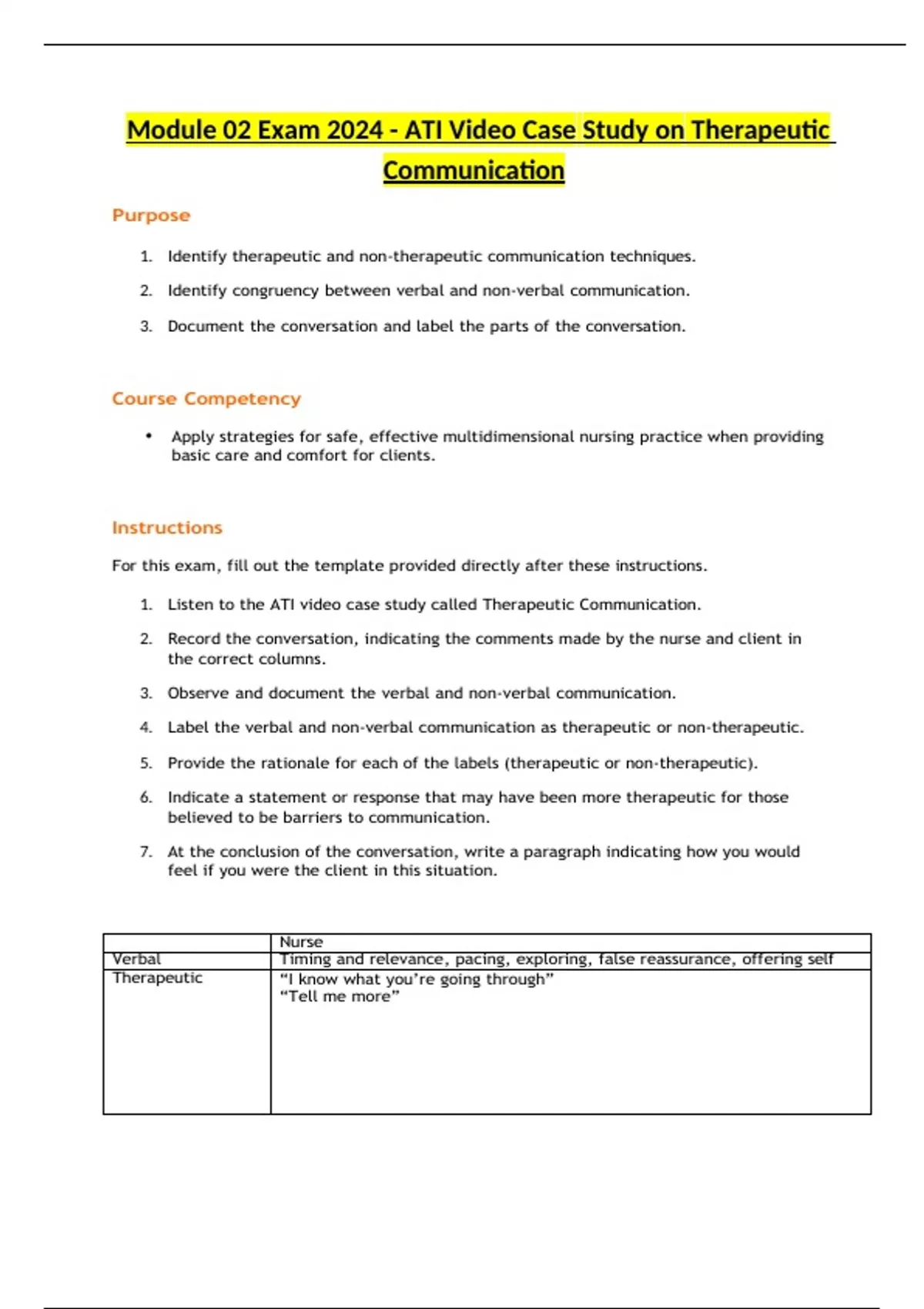 Module 02 Exam 2024 - ATI Video Case Study on Therapeutic Communication