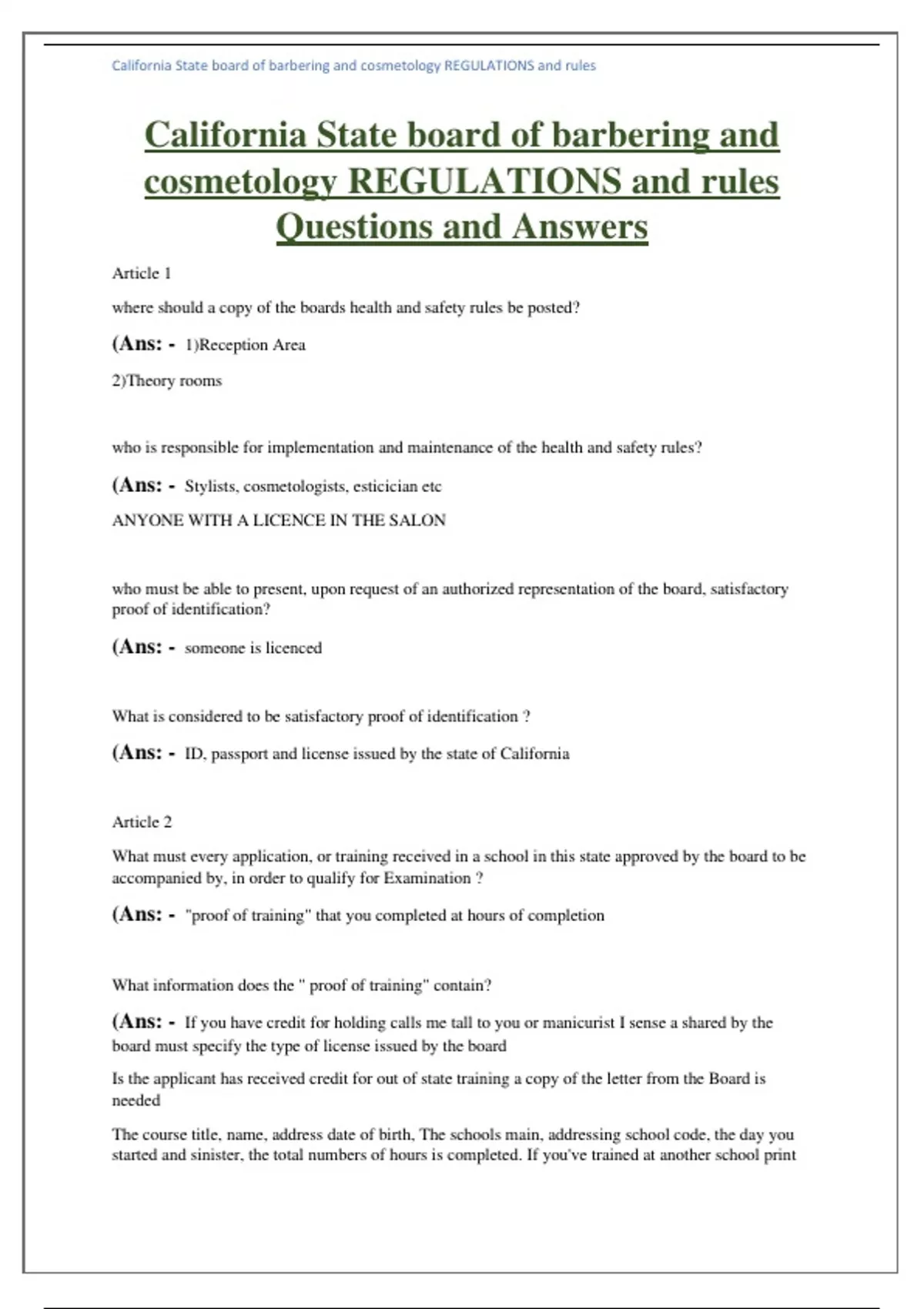 California State board of barbering and cosmetology REGULATIONS and rules Questions and Answers