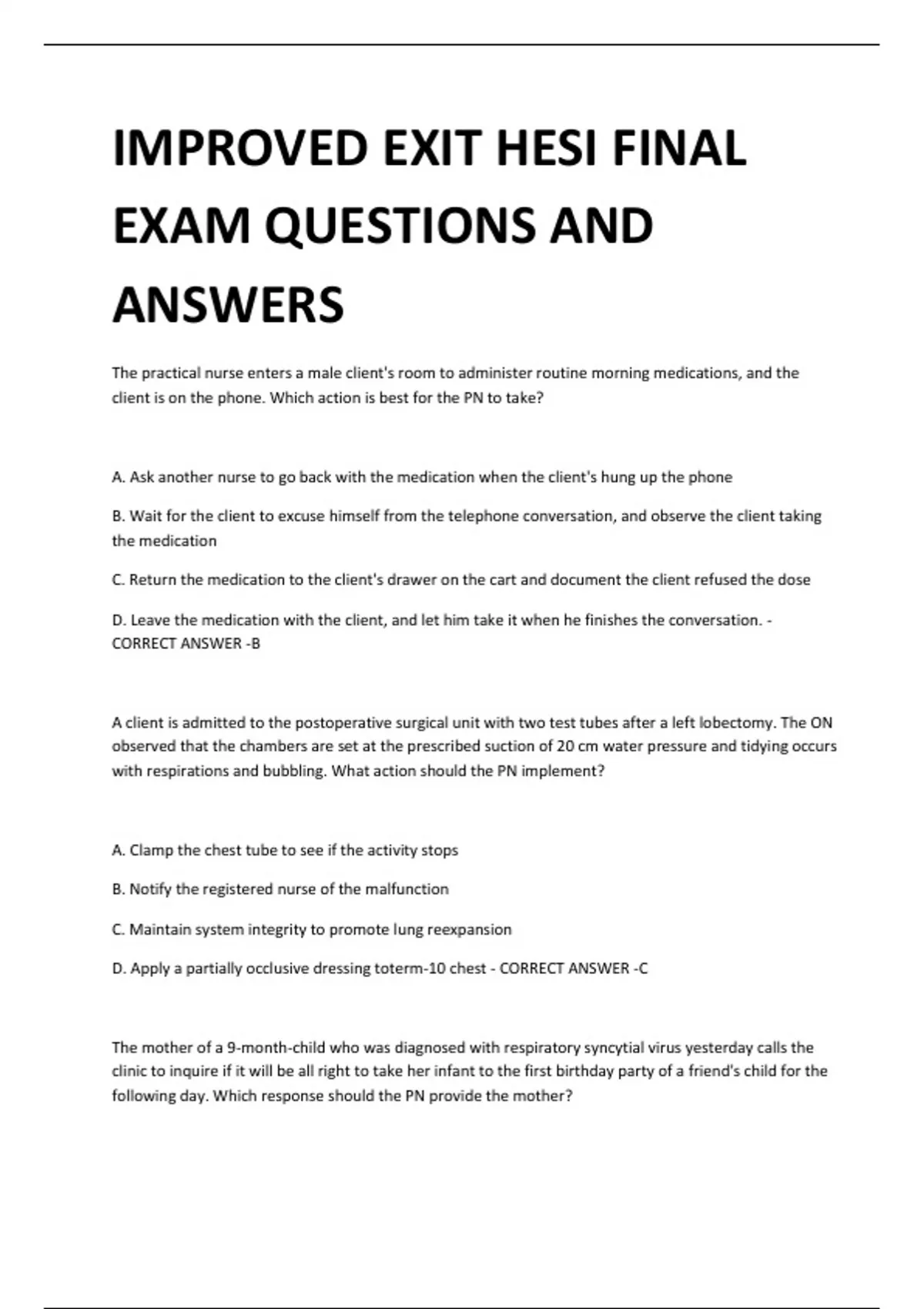 IMPROVED EXIT HESI FINAL EXAM QUESTIONS AND ANSWERS The practical nurse enters a male client's room to administer routine morning medications, and the client is on the phone. Which action is best for the PN to take? A. Ask another nurse to go back with the medication when the client's hung up the phone B. Wait for the client to excuse himself from the telephone conversation, and observe the client taking the medication C. Return the medication to the client's drawer on the cart and document the client refused the dose D. Leave the medication with the client, and let him take it when he finishes the conversation. - CORRECT ANSWER -B A client is admitted to the postoperative surgical unit with two test tubes after a left lobectomy. The ON observed that the chambers are set at the prescribed suction of 20 cm water pressure and tidying occurs with respirations and bubbling. What action should the PN implement? A. Clamp the chest tube to see if the activity stops B. Notify the registered nurse of the malfunction C. Maintain system integrity to promote lung reexpansion D. Apply a partially occlusive dressing toterm-10 chest - CORRECT ANSWER -C The mother of a 9-month-child who was diagnosed with respiratory syncytial virus yesterday calls the clinic to inquire if it will be all right to take her infant to the first birthday party of a friend's child for the following day. Which response should the PN provide the mother? A. Do not expose other children as the virus is very contagious even without direct contact B. The child will no longer be contagious, no need to take any further precautions C. The child can be around other children but should wear a mask D. Make sure there are no children under the age of 5 months around the infected child. - CORRECT ANSWER -A The practical nurse is assisting the nurse with the admission of a young adult female Korean exchange student with acute abdominal pain. Although the client has been able to easily answer questions, when asked about sexual activity, she looks away. What action should the PN take? A. Omit compelling this section of the assessment form B. Ask her if she would like an interpreter to ask her the question C. Reword the question in case the client did not understand D. Watch the client's response when asked a different question - CORRECT ANSWER -D During immediate postoperative period following a total hip placement, which intervention is most important for the PN to implement? A. Encourage client to use walker or cane when ambulating B. Keep client's hip aligned with knees abducted C. Teach client to sit on the side of the bed before standing D. Monitor urinary flow via indwelling catheter - CORRECT ANSWER -B A client confides to the PN that the client has been substituting herbal supplements for high blood pressure instead of the prescribed medication. How should the PN respond first?