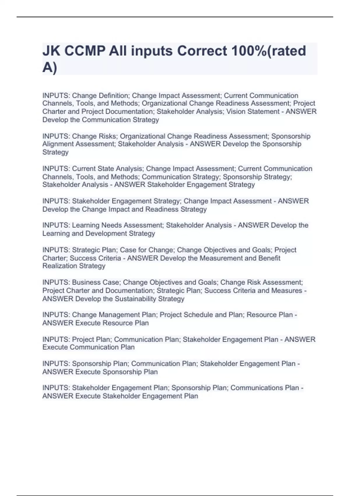 JK CCMP All inputs Correct 100%(rated A) INPUTS: Change Definition; Change Impact Assessment; Current Communication Channels, Tools, and Methods; Organizational Change Readiness Assessment; Project Charter and Project Documentation; Stakeholder Analysis; Vision Statement - ANSWER Develop the Communication Strategy INPUTS: Change Risks; Organizational Change Readiness Assessment; Sponsorship Alignment Assessment; Stakeholder Analysis - ANSWER Develop the Sponsorship Strategy INPUTS: Current State Analysis; Change Impact Assessment; Current Communication Channels, Tools, and Methods; Communication Strategy; Sponsorship Strategy; Stakeholder Analysis - ANSWER Stakeholder Engagement Strategy INPUTS: Stakeholder Engagement Strategy; Change Impact Assessment - ANSWER Develop the Change Impact and Readiness Strategy INPUTS: Learning Needs Assessment; Stakeholder Analysis - ANSWER Develop the Learning and Development Strategy