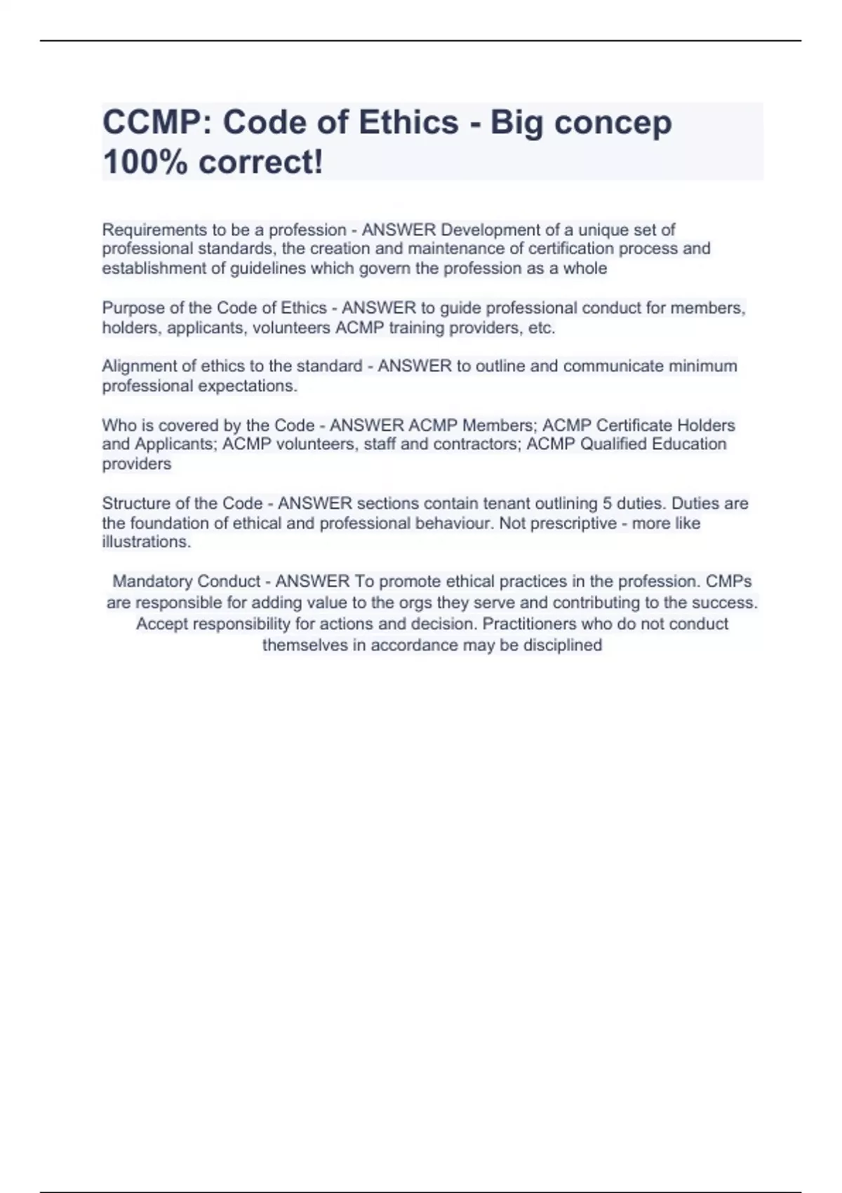 CCMP: Code of Ethics - Big concep 100% correct! Requirements to be a profession - ANSWER Development of a unique set of professional standards, the creation and maintenance of certification process and establishment of guidelines which govern the profession as a wholePurpose of the Code of Ethics - ANSWER to guide professional conduct for members, holders, applicants, volunteers ACMP training providers, etc.