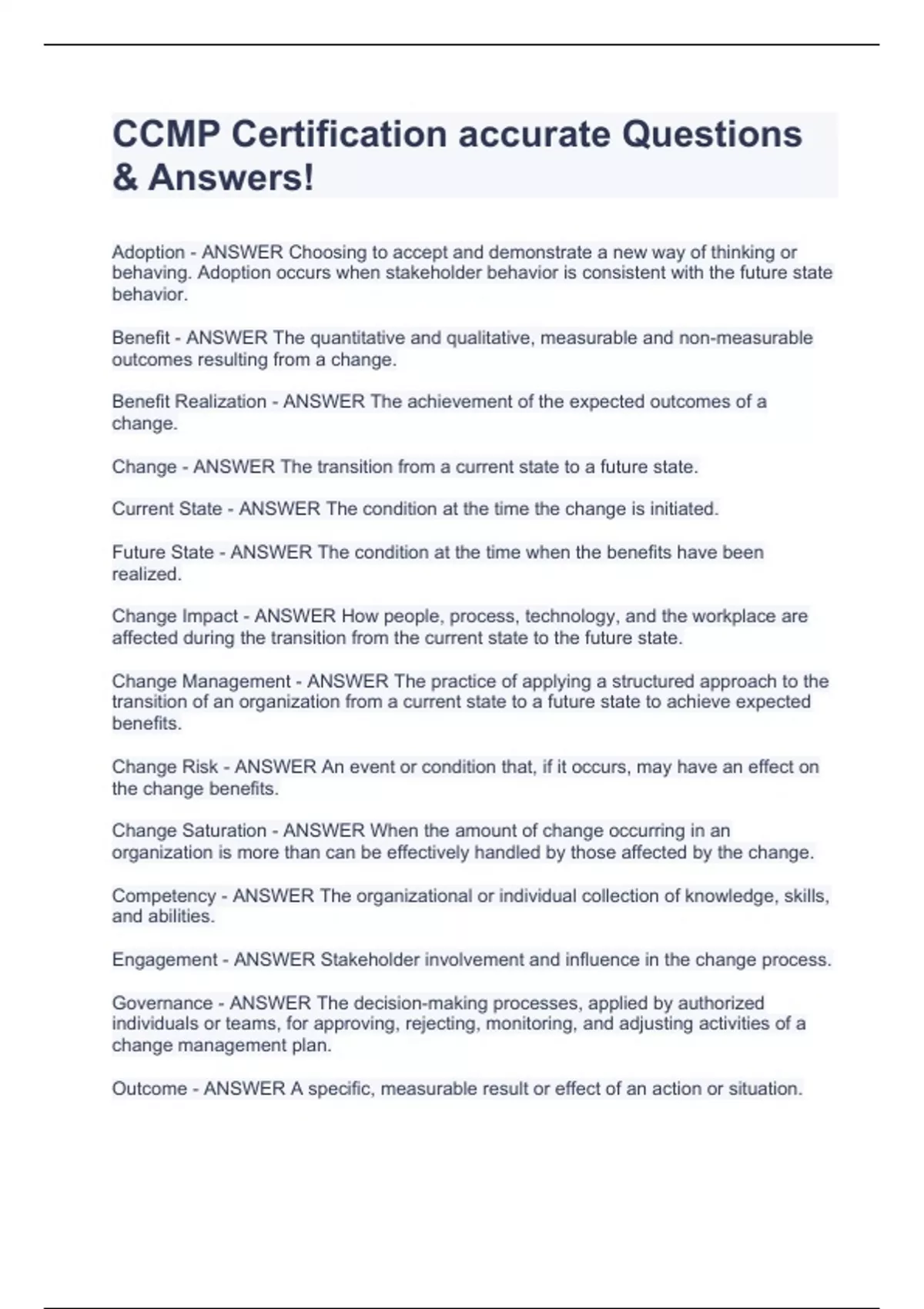 CCMP Certification accurate Questions & AnsAdoption - ANSWER Choosing to accept and demonstrate a new way of thinking or behaving. Adoption occurs when stakeholder behavior is consistent with the future state behavior. Benefit - ANSWER The quantitative and qualitative, measurable and non-measurable outcomes resulting from a change. Benefit Realization - ANSWER The achievement of the expected outcomes of a change. Change - ANSWER The transition from a current state to a future state. Current State - ANSWER The condition at the time the change is initiated. wers!