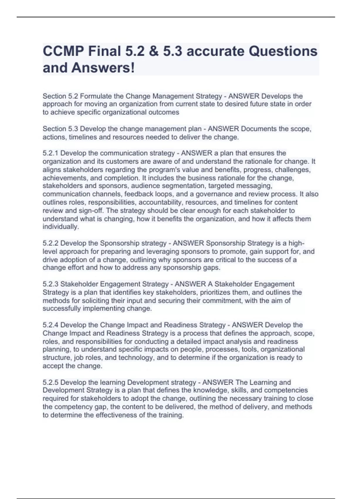 CCMP Final 5.2 & 5.3 accurate Questions and Answers! Section 5.2 Formulate the Change Management Strategy - ANSWER Develops the approach for moving an organization from current state to desired future state in order to achieve specific organizational outcomes Section 5.3 Develop the change management plan - ANSWER Documents the scope, actions, timelines and resources needed to deliver the change. 5.2.1 Develop the communication strategy - ANSWER a plan that ensures the organization and its customers are aware of and understand the rationale for change. It aligns stakeholders regarding the program's value and benefits, progress, challenges, achievements, and completion. It includes the business rationale for the change, stakeholders and sponsors, audience segmentation, targeted messaging, communication channels, feedback loops, and a governance and review process. It also outlines roles, responsibilities, accountability, resources, and timelines for content review and sign-off. The strategy should be clear enough for each stakeholder to understand what is changing, how it benefits the organization, and how it affects them individually. 5.2.2 Develop the Sponsorship strategy - ANSWER Sponsorship Strategy is a high-level approach for preparing and leveraging sponsors to promote, gain support for, and drive adoption of a change, outlining why sponsors are critical to the success of a change effort and how to address any sponsorship gaps.