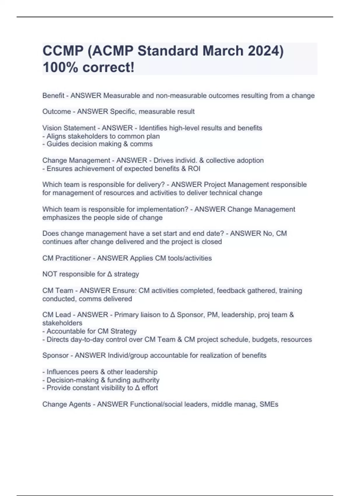 CCMP (ACMP Standard March 2024) 100% correct! Benefit - ANSWER Measurable and non-measurable outcomes resulting from a change Outcome - ANSWER Specific, measurable result Vision Statement - ANSWER - Identifies high-level results and benefits - Aligns stakeholders to common plan - Guides decision making & comms Change Management - ANSWER - Drives individ. & collective adoption - Ensures achievement of expected benefits & ROI Which team is responsible for delivery? - ANSWER Project Management responsible for management of resources and activities to deliver technical change Which team is responsible for implementation? - ANSWER Change Management emphasizes the people side of change