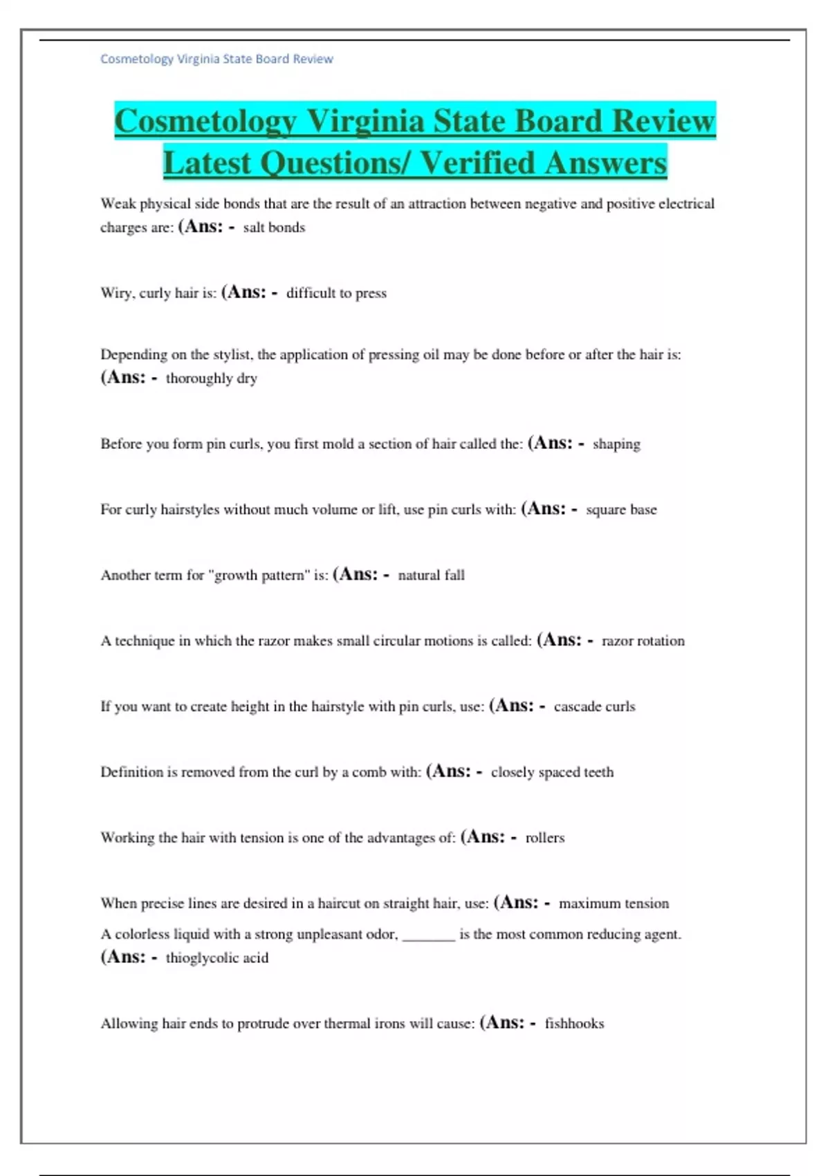 Cosmetology Virginia State Board Review Latest Questions/ Verified Answers