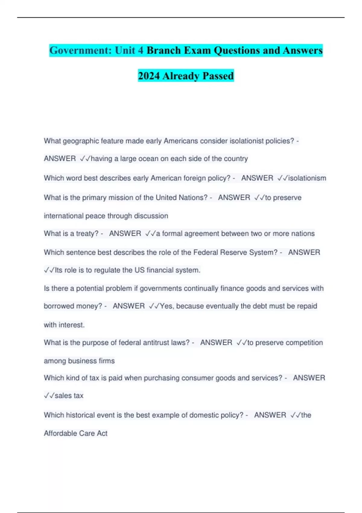 Government: Unit 4 Branch Exam Questions and Answers 2024 Already Passed
