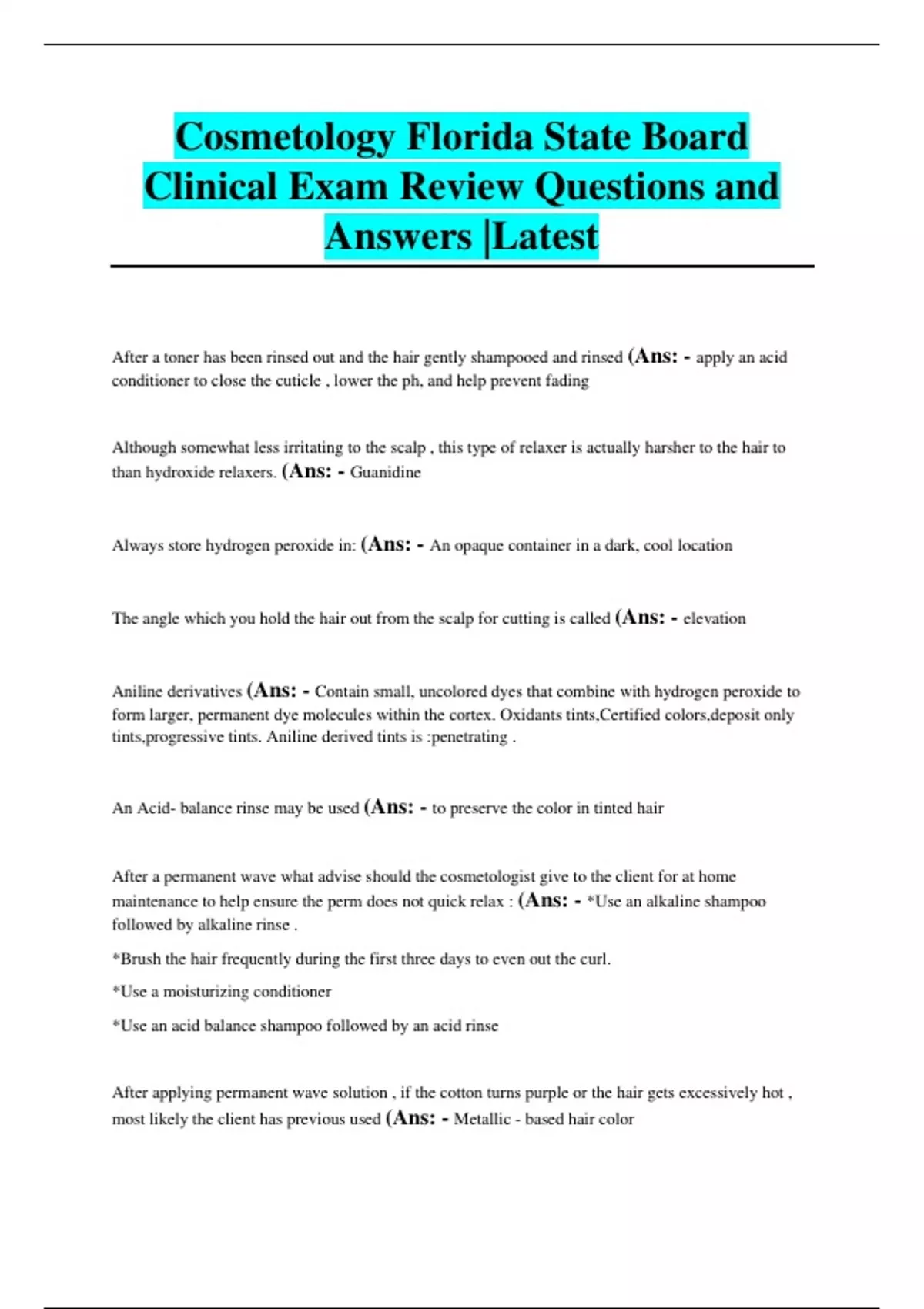 Cosmetology Florida State Board Clinical Exam Review Questions and Answers |Latest After a toner has been rinsed out and the hair gently shampooed and rinsed (Ans: - apply an acid conditioner to close the cuticle , lower the ph, and help prevent fading Although somewhat less irritating to the scalp , this type of relaxer is actually harsher to the hair to than hydroxide relaxers. (Ans: - Guanidine Always store hydrogen peroxide in: (Ans: - An opaque container in a dark, cool location The angle which you hold the hair out from the scalp for cutting is called (Ans: - elevation Aniline derivatives (Ans: - Contain small, uncolored dyes that combine with hydrogen peroxide to form larger, permanent dye molecules within the cortex. Oxidants tints,Certified colors,deposit only tints,progressive tints. Aniline derived tints is :penetrating . An Acid- balance rinse may be used (Ans: - to preserve the color in tinted hair After a permanent wave what advise should the cosmetologist give to the client for at home maintenance to help ensure the perm does not quick relax : (Ans: - *Use an alkaline shampoo followed by alkaline rinse . *Brush the hair frequently during the first three days to even out the curl. *Use a moisturizing conditioner *Use an acid balance shampoo followed by an acid rinse After applying permanent wave solution , if the cotton turns purple or the hair gets excessively hot , most likely the client has previous used (Ans: - Metallic - based hair color Ash, smoky, and drab are terms used to describe: (Ans: - green, blue, violet