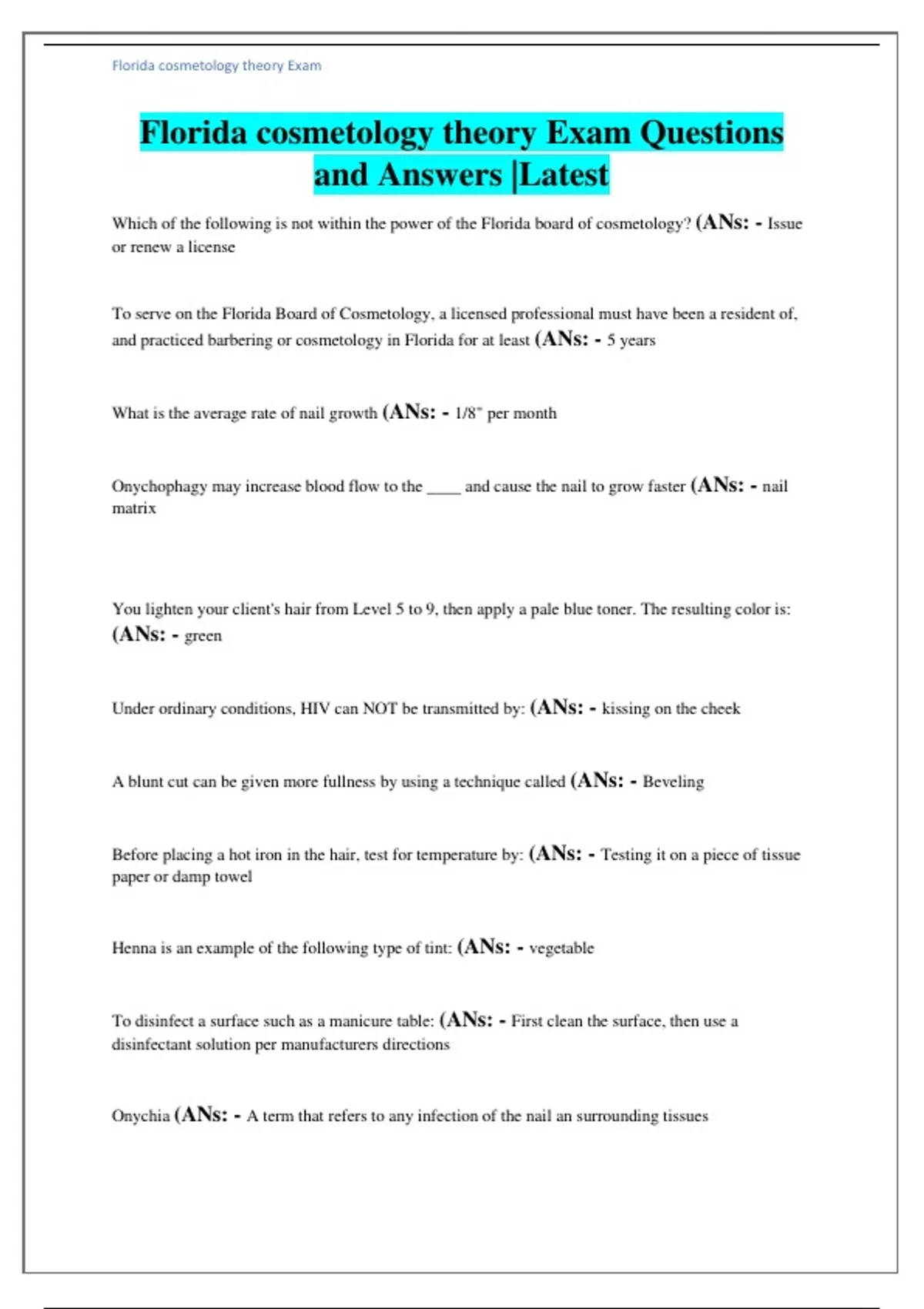 Florida cosmetology theory Exam Questions and Answers |Latest Which of the following is not within the power of the Florida board of cosmetology? (ANs: - Issue or renew a license To serve on the Florida Board of Cosmetology, a licensed professional must have been a resident of, and practiced barbering or cosmetology in Florida for at least (ANs: - 5 years What is the average rate of nail growth (ANs: - 1/8" per month Onychophagy may increase blood flow to the ____ and cause the nail to grow faster (ANs: - nail matrix