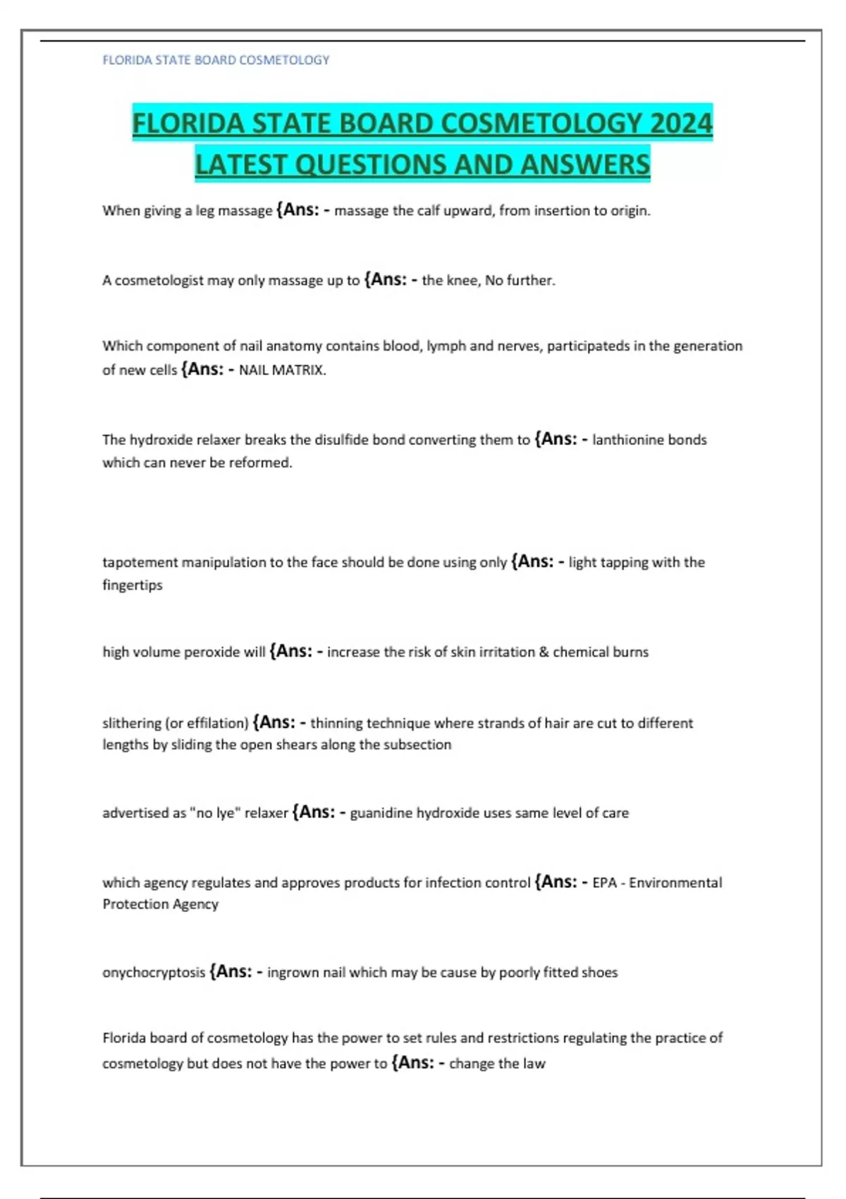 FLORIDA STATE BOARD COSMETOLOGY 2024 LATEST QUESTIONS AND ANSWERS When giving a leg massage {Ans: - massage the calf upward, from insertion to origin. A cosmetologist may only massage up to {Ans: - the knee, No further. Which component of nail anatomy contains blood, lymph and nerves, participateds in the generation of new cells {Ans: - NAIL MATRIX. The hydroxide relaxer breaks the disulfide bond converting them to {Ans: - lanthionine bonds which can never be reformed.