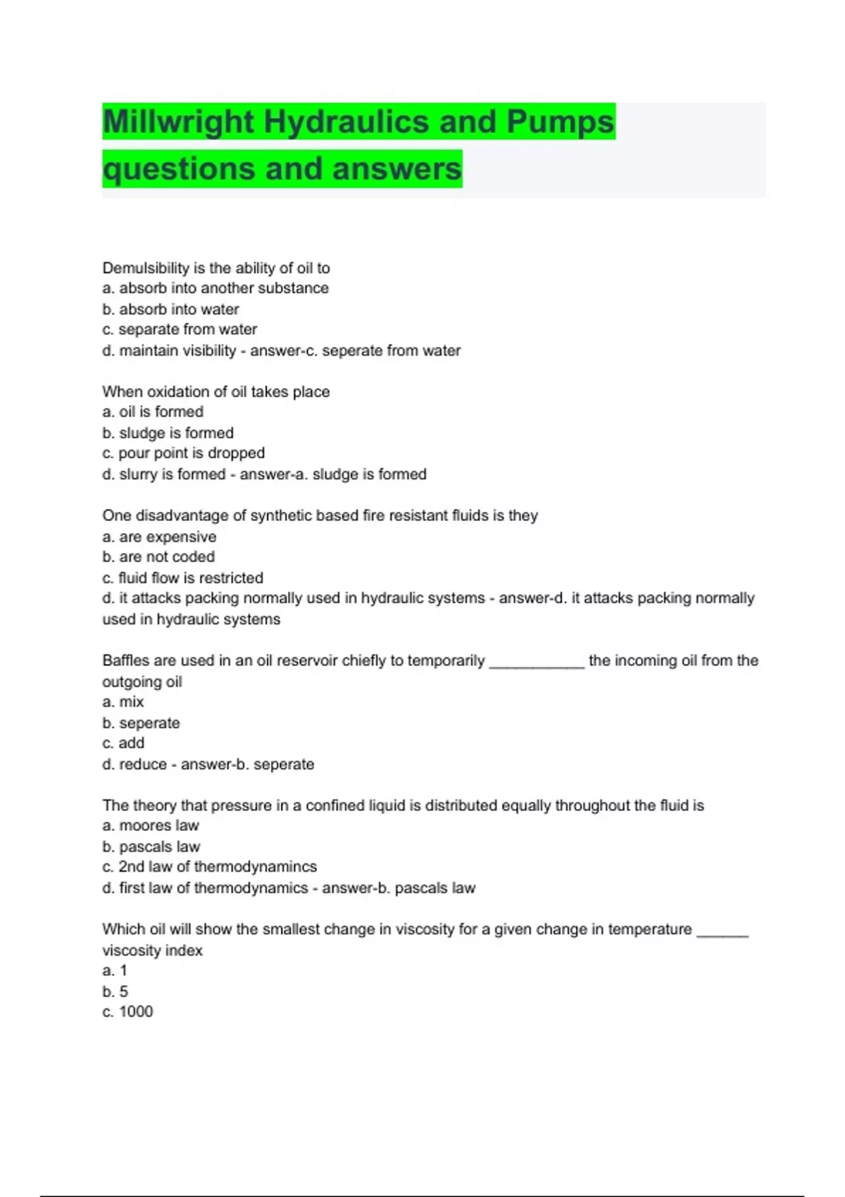 Millwright Hydraulics and Pumps questions and answers