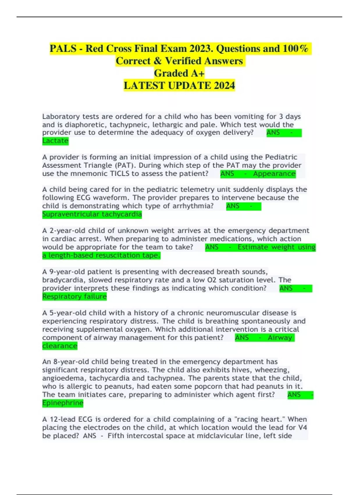 PALS - Red Cross Final Exam 2023. Questions and 100% Correct & Verified Answers Graded A+ LATEST UPDATE 2024