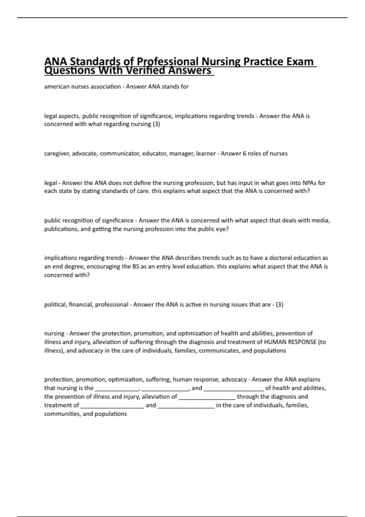 ANA Standards of Professional Nursing Practice Exam Questions With Verified Answers
