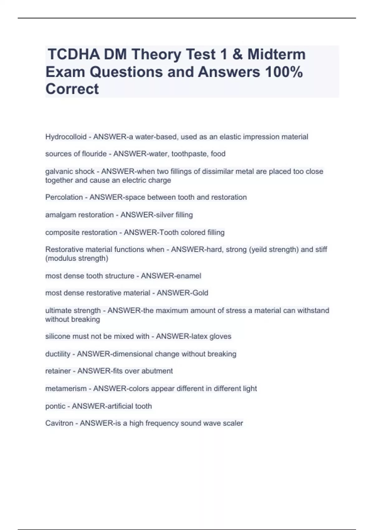 TCDHA DM Theory Test 1 & Midterm Exam Questions and Answers 100% Correct TCDHA DM Theory Test 1 & Midterm Exam Questions and Answers 100% Correct TCDHA DM Theory Test 1 & Midterm Exam Questions and Answers 100% Correct Hydrocolloid - ANSWER-a water-based, used as an elastic impression material sources of flouride - ANSWER-water, toothpaste, food galvanic shock - ANSWER-when two fillings of dissimilar metal are placed too close together and cause an electric charge Percolation - ANSWER-space between tooth and restoration