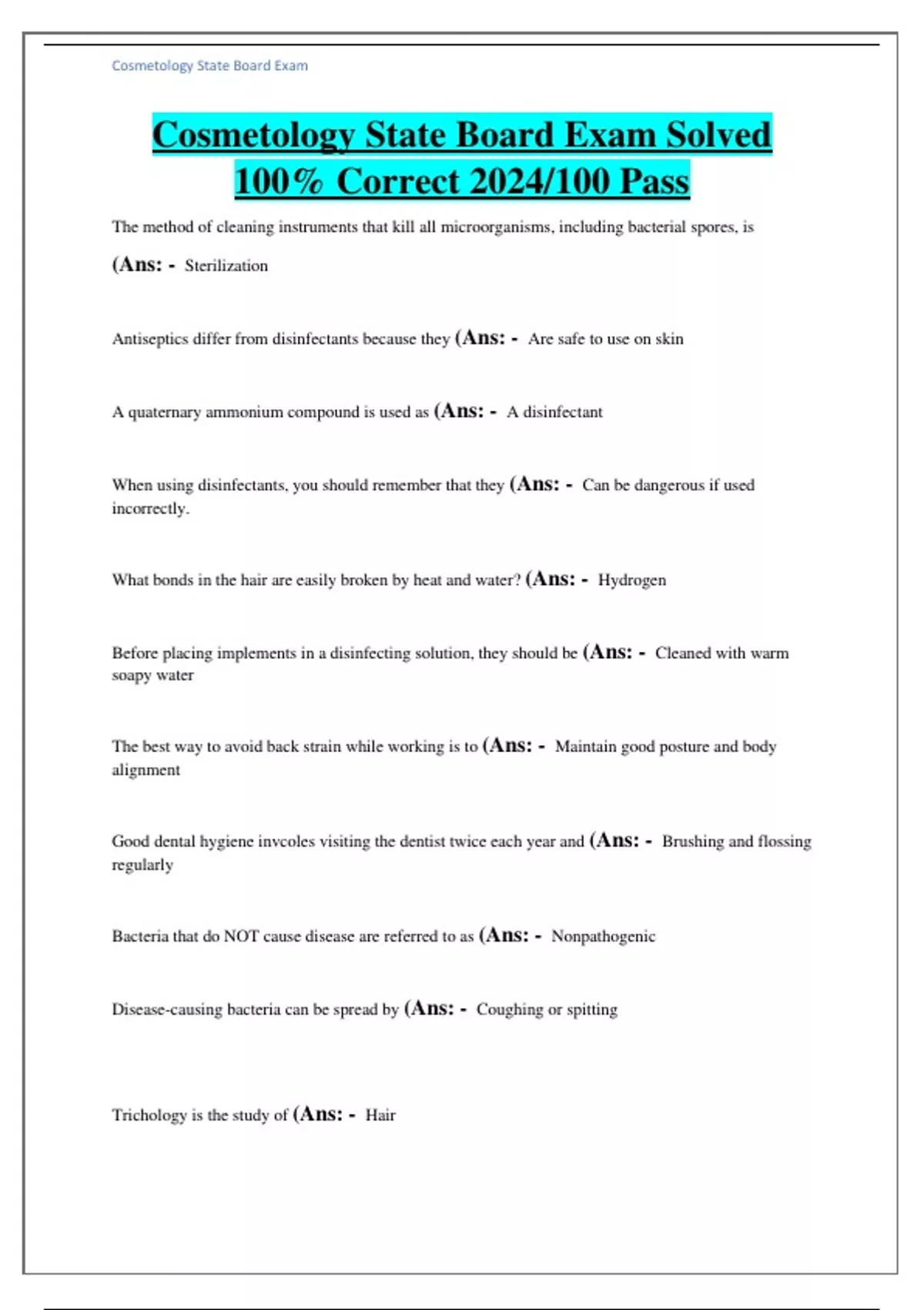 Cosmetology State Board Exam Solved 100% Correct 2024/100 Pass