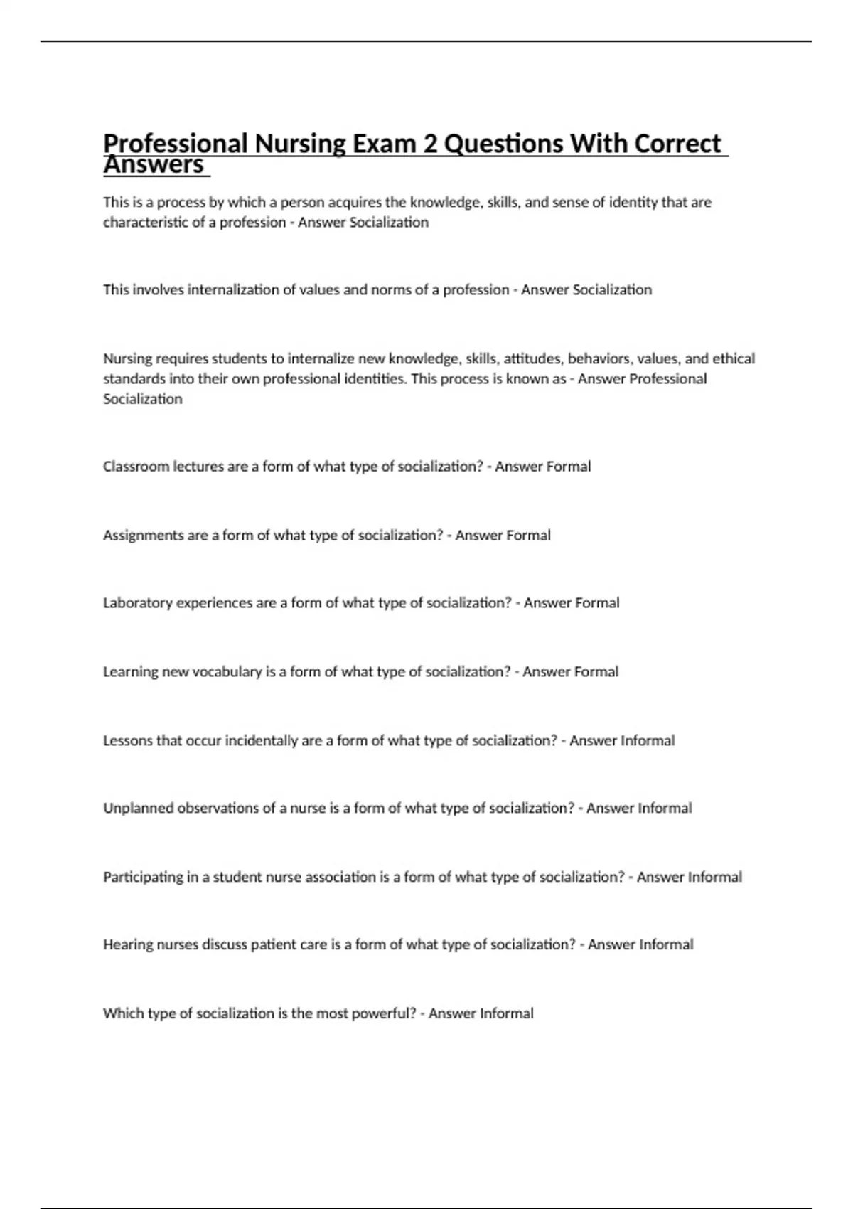 This is a process by which a person acquires the knowledge, skills, and sense of identity that are characteristic of a profession - Answer Socialization This involves internalization of values and norms of a profession - Answer Socialization Nursing requires students to internalize new knowledge, skills, attitudes, behaviors, values, and ethical standards into their own professional identities. This process is known as - Answer Professional Socialization Classroom lectures are a form of what type of socialization? - Answer Formal Assignments are a form of what type of socialization? - Answer Formal Laboratory experiences are a form of what type of socialization? - Answer Formal Learning new vocabulary is a form of what type of socialization? - Answer Formal Lessons that occur incidentally are a form of what type of socialization? - Answer Informal Unplanned observations of a nurse is a form of what type of socialization? - Answer Informal Participating in a student nurse association is a form of what type of socialization? - Answer Informal Hearing nurses discuss patient care is a form of what type of socialization? - Answer Informal Which type of socialization is the most powerful? - Answer Informal Absorbing and assimilating the culture of nursing: its rite, rituals, and valued behaviors is what? - Answer Socialization What are the goals of professional socialization? - Answer -to learn the technology of the profession - to learn to internalize the professional culture - to find a personally and professionally acceptable version of the role - to integrate this professional role into all of the other life roles Professional nursing is a _____. - Answer culture What are the rules that determine roles? - Answer Structure conditions What are the idea systems prevalent in a society as expressed in words, symbols, and ceremonies? - Answer Cultural conditions Structural and cultural conditions are - Answer interrelated What is the key to keeping the profession vital and dynamic while preserving a fundamental focus on human response in health and illness - Answer Developing a common nursing consciousness What stage is this? Reliant on external authority, with limited questioning ability or critical analysis. As a student at this stage, you are unlikely to question or analyze critically the concepts teachers present because you lack the necessary background to do so. As a student, you are extremely dependent on faculty; you have lots of concern about doing things right and being unsure of your knowledge. At this stage, you simply do as you are told. - Answer Stage 1 (unilateral dependence) of Cohen's Model of Basic Student Socialization Cognitive rebellion, diminished reliance on external authority. As a student at this stage, your critical thinking abilities and knowledge bases expand. You begin to rely on your own judgment and think critically about what you are being taught. As a student, you are like a toddler in terrible 2s ("no"); an I'll do it myself attitude where you are beginning to feel more confident in your skills and basic stuff gets old and boring. "Why do I have to learn this? What does this have to do with nursing?" - Answer Stage 2 (Negativity/Independence) of Cohen's Model of Basic Student Socialization Reasoned appraisal; begins integration of facts and opinions following objective testing. Students evaluate the ideas of others. They develop an increasingly realistic appraisal process and learn to test concepts facts, ideas and models objectively. You are more impartial and begin to accept some ideas and reject others. You recognize that you may not know it all and can still use some guidance. You begin to appreciate the nursing process as a way to organize your care. - Answer Stage 3 (Dependence/mutuality) of Cohen's Model of Basic Student Socialization Collaborative decision-making, commitment to professional role; self-concept now includes professional role identity. You recognize that you know so much but you will never know it all; use resources including faculty to help you throughout your nursing career. You are highly self-directed at this point, and you seek out learning experiences to maximize your knowledge before you enter the "real world" of nursing. - Answer Stage 4 (Interdependence) of Cohen's Model of Basic Student Socialization What stage is this? at least 1 year out of school; lots of questions and insecurities - Answer Stage 1 (Novice) of Benner's Novice to Expert (1 year out of school) What stage is this? 1-2 years; getting good experience but still not a lot of self confidence - Answer Stage 2 (Advanced Beginner) of Benner's Novice to Expert (1-2 years) What stage is this? 2-3 years; feels competent, organized; plans and sets goals; thinks abstractly and analytically; coordinates several tasks simultaneously - Answer Stage 3 (Competent practitioner) of Benner's Novice to Expert (2-3 years) What stage is this? 3-5 years; views patient holistically; easily recognizes subtle changes and sets priorities; focuses on long-term goals - Answer Stage 4 (Proficient practitioner) of Benner's Novice to Expert (3-5 years) What stage is this? 5+ years; performs fluidly; grasps patient needs automatically; responses are integrated; expertise comes naturally - Answer Stage 5 (Expert practitioner) 5+ years Socialization is a __________ activity. - Answer lifelong What is a conflict of ideals with reality in the workplace? - Answer Reality Shock This is when new grads suddenly become aware of the discrepancy between real world and the ideals of the nursing profession. - Answer Reality Shock Why does the reality shock happen according to Kramer? - Answer lack of support, gap between ideals and actual work setting, inability to implement desired nursing care Many nurses fail to ____ the reality shock and "drop out", rather than ____ it and taking steps to ______ it. - Answer recognize; acknowledging; resolve What phase of reality shock is this? new grad is excited, idealist