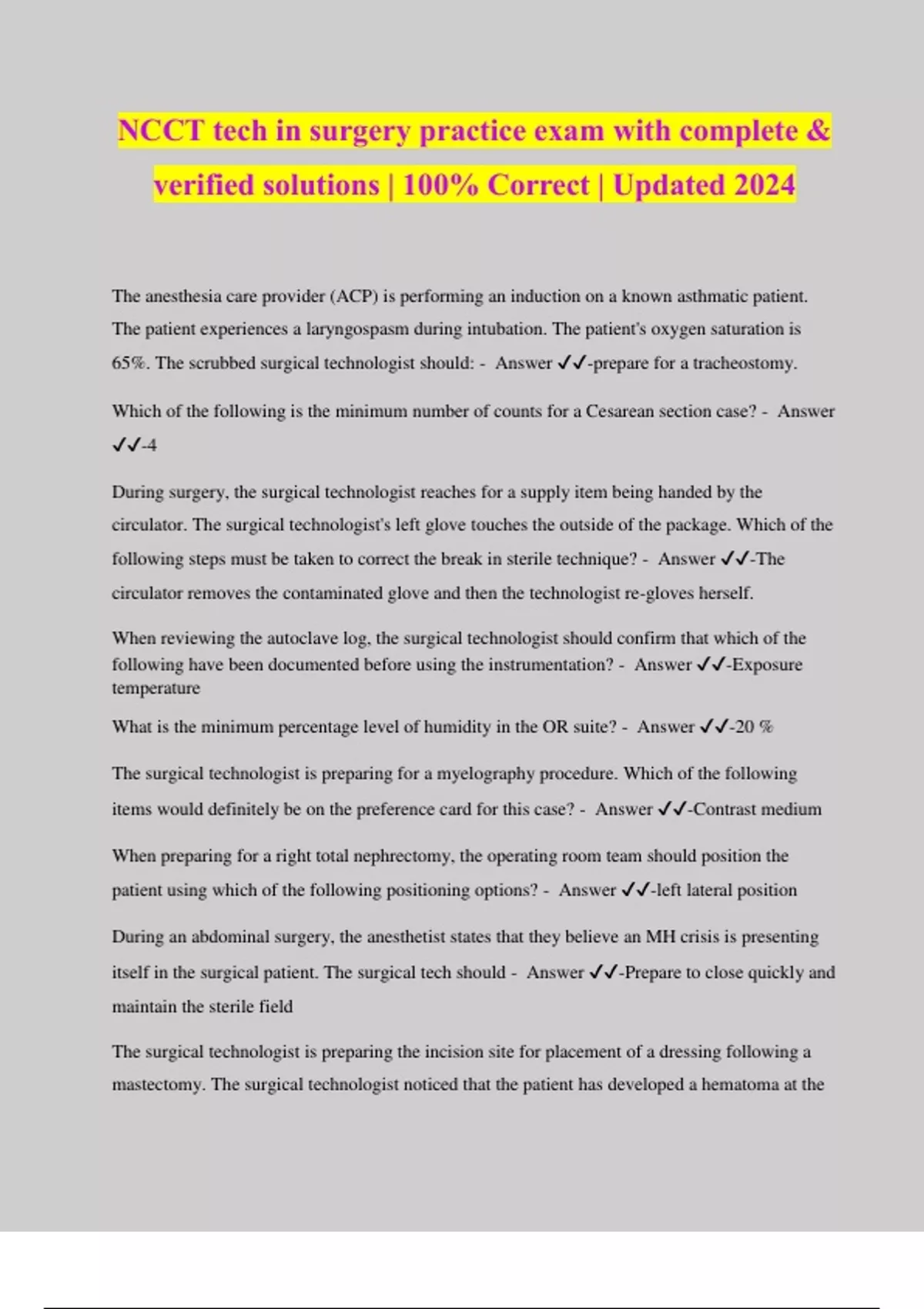 NCCT tech in surgery practice exam with complete & verified solutions | 100% Correct | Updated 2024 The anesthesia care provider (ACP) is performing an induction on a known asthmatic patient. The patient experiences a laryngospasm during intubation. The patient's oxygen saturation is 65%. The scrubbed surgical technologist should: - Answer ️️ -prepare for a tracheostomy. Which of the following is the minimum number of counts for a Cesarean section case? - Answer ️️ -4 During surgery, the surgical technologist reaches for a supply item being handed by the circulator. The surgical technologist's left glove touches the outside of the package. Which of the following steps must be taken to correct the break in sterile technique? - Answer ️️ -The circulator removes the contaminated glove and then the technologist re-gloves herself. When reviewing the autoclave log, the surgical technologist should confirm that which of the following have been documented before using the instrumentation? - Answer ️️ -Exposure temperature What is the minimum percentage level of humidity in the OR suite? - Answer ️️ -20 % The surgical technologist is preparing for a myelography procedure. Which of the following items would definitely be on the preference card for this case? - Answer ️️ -Contrast medium When preparing for a right total nephrectomy, the operating room team should position the patient using which of the following positioning options? - Answer ️️ -left lateral position During an abdominal surgery, the anesthetist states that they believe an MH crisis is presenting itself in the surgical patient. The surgical tech should - Answer ️️ -Prepare to close quickly and maintain the sterile field The surgical technologist is preparing the incision site for placement of a dressing following a mastectomy. The surgical technologist noticed that the patient has developed a hematoma at the incision site. The surgeon has left the operating room. Which of the following actions should the surgical technologist take? - Answer ️️ -Ask the surgeon to return. The surgical technologist should use which of the following disinfectants when reprocessing an endotracheal tube used during surgery? - Answer ️️ -Cidex OPA A patient is having a cervical cone biopsy. The surgeon prefers to not use a Bovie. Which of the following solutions should the surgical technologist have available in the room for control of bleeding? - Answer ️️ -Monsels solution Before use of the ESU generator the surgical technologist should check for the - Answer ️️ - biomedical engineering sticker. A gynecologic oncology surgeon decides to bring her patient into the OR emergently after seeing her in the office. The patient's abdomen is greatly distended, warm and firm to the touch. Which of the following should the surgical technologist have available? - Answer ️️ -Poole tip suction and Lap sponges At the end of each case the surgical technologist should - Answer ️️ -rinse blood from the instruments with sterile water. A cardiac arrest occurs during a thoracotomy procedure, and the surgeon calls a CODE BLUE. The surgeon is attempting to resuscitate the patient using CPR. Which of the following is the responsibility of the surgical technologist in this situation? - Answer ️️ -Prepare internal defibrillator paddles. Which of the following is being tested when doing a Bowie-Dick test on an autoclave? - Answer ️️ -Amount of air removed from the autocl