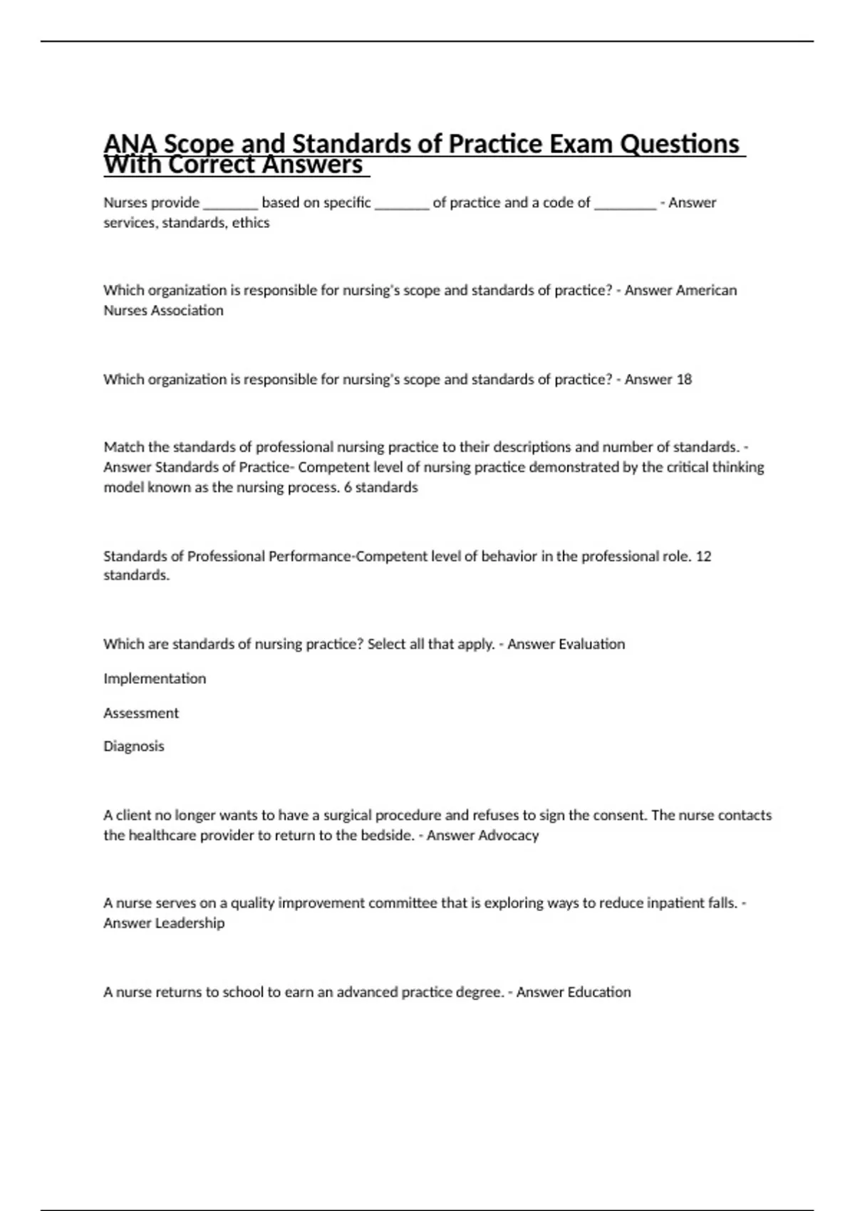 ANA Scope and Standards of Practice Exam Questions With Correct Answers