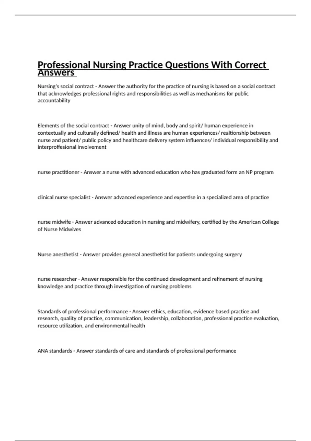 Nursing's social contract - Answer the authority for the practice of nursing is based on a social contract that acknowledges professional rights and responsibilities as well as mechanisms for public accountability Elements of the social contract - Answer unity of mind, body and spirit/ human experience in contextually and culturally defined/ health and illness are human experiences/ realtionship between nurse and patient/ public policy and healthcare delivery system influences/ individual responsibility and interproffesional involvement nurse practitioner - Answer a nurse with advanced education who has graduated form an NP program clinical nurse specialist - Answer advanced experience and expertise in a specialized area of practice nurse midwife - Answer advanced education in nursing and midwifery, certified by the American College of Nurse Midwives Nurse anesthetist - Answer provides general anesthetist for patients undergoing surgery nurse researcher - Answer responsible for the continued development and refinement of nursing knowledge and practice through investigation of nursing problems Standards of professional performance - Answer ethics, education, evidence based practice and research, quality of practice, communication, leadership, collaboration, professional practice evaluation, resource utilization, and environmental health ANA standards - Answer standards of care and standards of professional performance Nursing - Answer the protection, promotion and optimization of health and abilities, prevention of illness and injury, alleviation of suffering through diagnosis and treatment of human response, and advocacy int he care of individuals, families, communities, and populations Nurse practice Act - Answer each state defines the practice of nursing within that area, set requirements for licensure American Nurses Association - Answer nurses professional organization, sets the standards of practice for nurses and makes decisions about the functions, activities, and goals of the nursing profession; only for registered nurses Model of Professional Nursing practice - Answer encompasses evidence, quality and safety; the is the initial scope of practice with standards and a code, then the nurse practice act with rules and regulations, specific institutional policies and procedure and lastly self-determination Educational preparation - Answer LPN role which is limited, AD or diploma program, BSN, Masters ... CNL,CNS,NP, Nurse midwife, and Nurse anesthetist, PhD or DNS in DNP Licensing Agency - Answer National Council of State Boards of Nursing, Boards of Nursing, National Council of Licensure Examination (NCLEX and Pearson Vue) Pearson Vue - Answer testing location to take examination for licensure Boards of Nursing - Answer gives accreditation to a program giving more rules for the program to follow