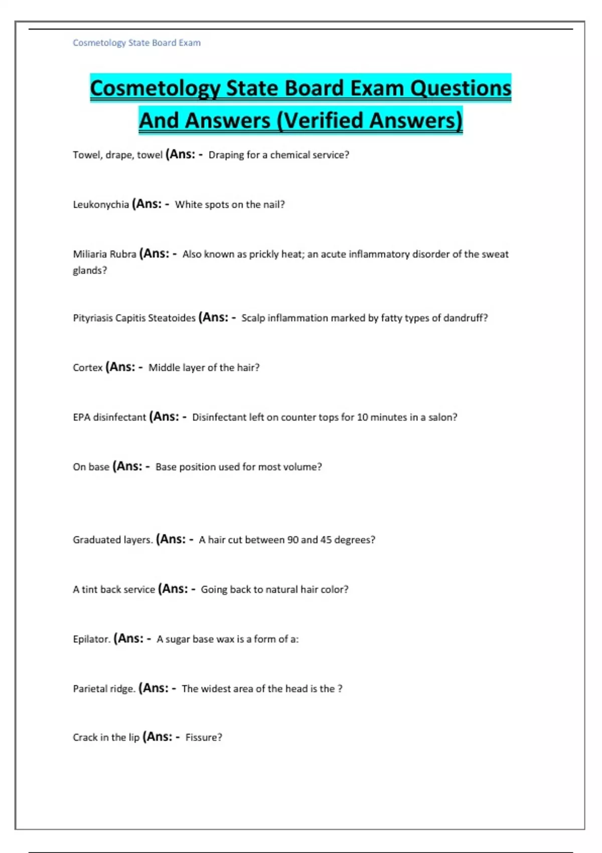 Cosmetology State Board Exam Questions And Answers (Verified Answers) Towel, drape, towel (Ans: - Draping for a chemical service? Leukonychia (Ans: - White spots on the nail? Miliaria Rubra (Ans: - Also known as prickly heat; an acute inflammatory disorder of the sweat glands? Pityriasis Capitis Steatoides (Ans: - Scalp inflammation marked by fatty types of dandruff?