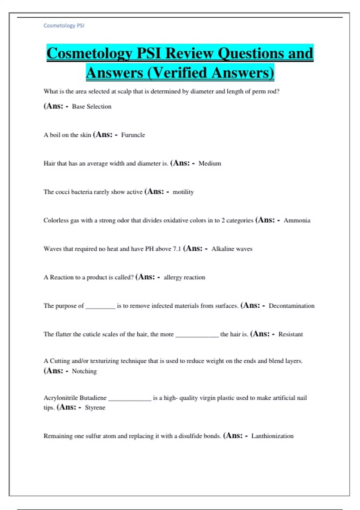 Cosmetology PSI Review Questions and Answers (Verified Answers)|Test Bank What is the area selected at scalp that is determined by diameter and length of perm rod? (Ans: - Base Selection A boil on the skin (Ans: - Furuncle Hair that has an average width and diameter is. (Ans: - Medium The cocci bacteria rarely show active (Ans: - motility Colorless gas with a strong odor that divides oxidative colors in to 2 categories (Ans: - Ammonia Waves that required no heat and have PH above 7.1 (Ans: - Alkaline waves A Reaction to a product is called? (Ans: - allergy reaction The purpose of _________ is to remove infected materials from surfaces. (Ans: - Decontamination The flatter the cuticle scales of the hair, the more _____________ the hair is. (Ans: - Resistant A Cutting and/or texturizing technique that is used to reduce weight on the ends and blend layers. (Ans: - Notching Acrylonitrile Butadiene _____________ is a high- quality virgin plastic used to make artificial nail tips. (Ans: - Styrene Remaining one sulfur atom and replacing it with a disulfide bonds. (Ans: - Lanthionization Resting the Perm rods on an area of the base with in a Subsection of hair is referred as.. (Ans: - Rod Placement