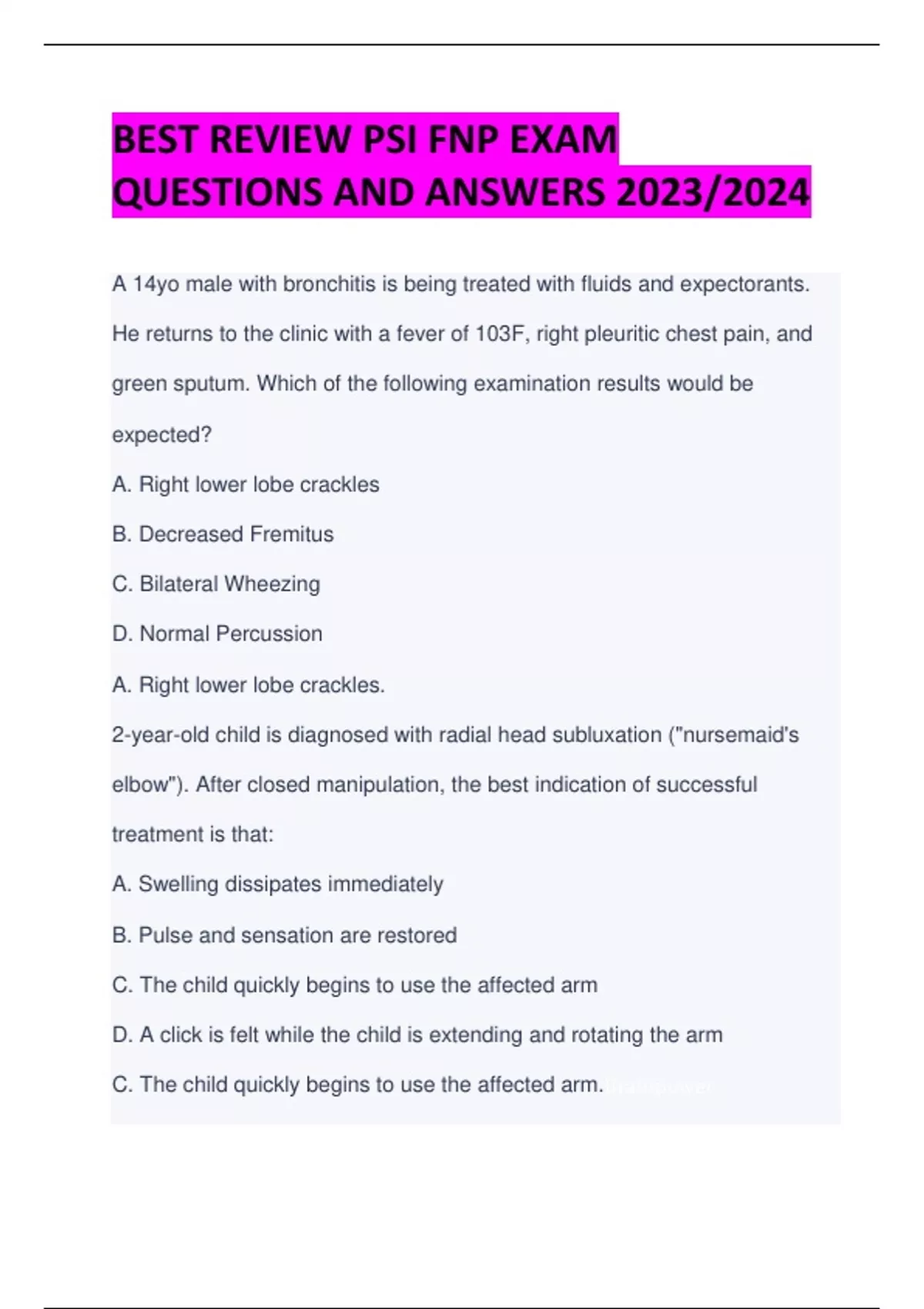 BEST REVIEW PSI FNP EXAM QUESTIONS AND ANSWERS 2023/2024