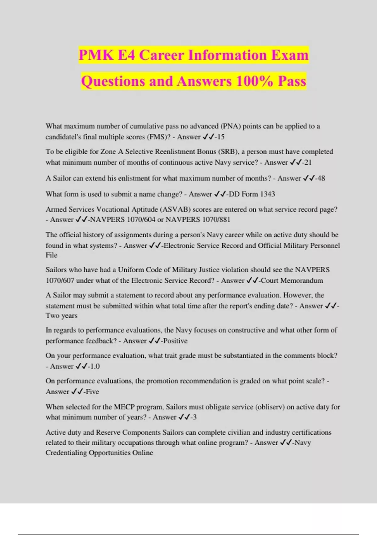 PMK E4 Career Information Exam Questions and Answers 100% Pass What maximum number of cumulative pass no advanced (PNA) points can be applied to a candidatel's final multiple scores (FMS)? - Answer ️️ -15 To be eligible for Zone A Selective Reenlistment Bonus (SRB), a person must have completed what minimum number of months of continuous active Navy service? - Answer ️️ -21 A Sailor can extend his enlistment for what maximum number of months? - Answer ️️ -48 What form is used to submit a name change? - Answer ️️ -DD Form 1343 Armed Services Vocational Aptitude (ASVAB) scores are entered on what service record page? - Answer ️️ -NAVPERS 1070/604 or NAVPERS 1070/881 The official history of assignments during a person's Navy career while on active duty should be found in what systems? - Answer ️️ -Electronic Service Record and Official Military Personnel File Sailors who have had a Uniform Code of Military Justice violation should see the NAVPERS 1070/607 under what of the Electronic Service Record? - Answer ️️ -Court Memorandum A Sailor may submit a statement to record about any performance evaluation. However, the statement must be submitted within what total time after the report's ending date? - Answer ️️ - Two years In regards to performance evaluations, the Navy focuses on constructive and what other form of performance feedback? - Answer ️️ -Positive On your performance evaluation, what trait grade must be substantiated in the comments block? - Answer ️️ -1.0 On performance evaluations, the promotion recommendation is graded on what point scale? - Answer ️️ -Five When selected for the MECP program, Sailors must obligate service (obliserv) on active daty for what minimum number of years? - Answer ️️ -3 Active duty and Reserve Components Sailors can complete civilian and industry certifications related to their military occupations through what online program? - Answer ️️ -Navy Credentialing Opportunities Online